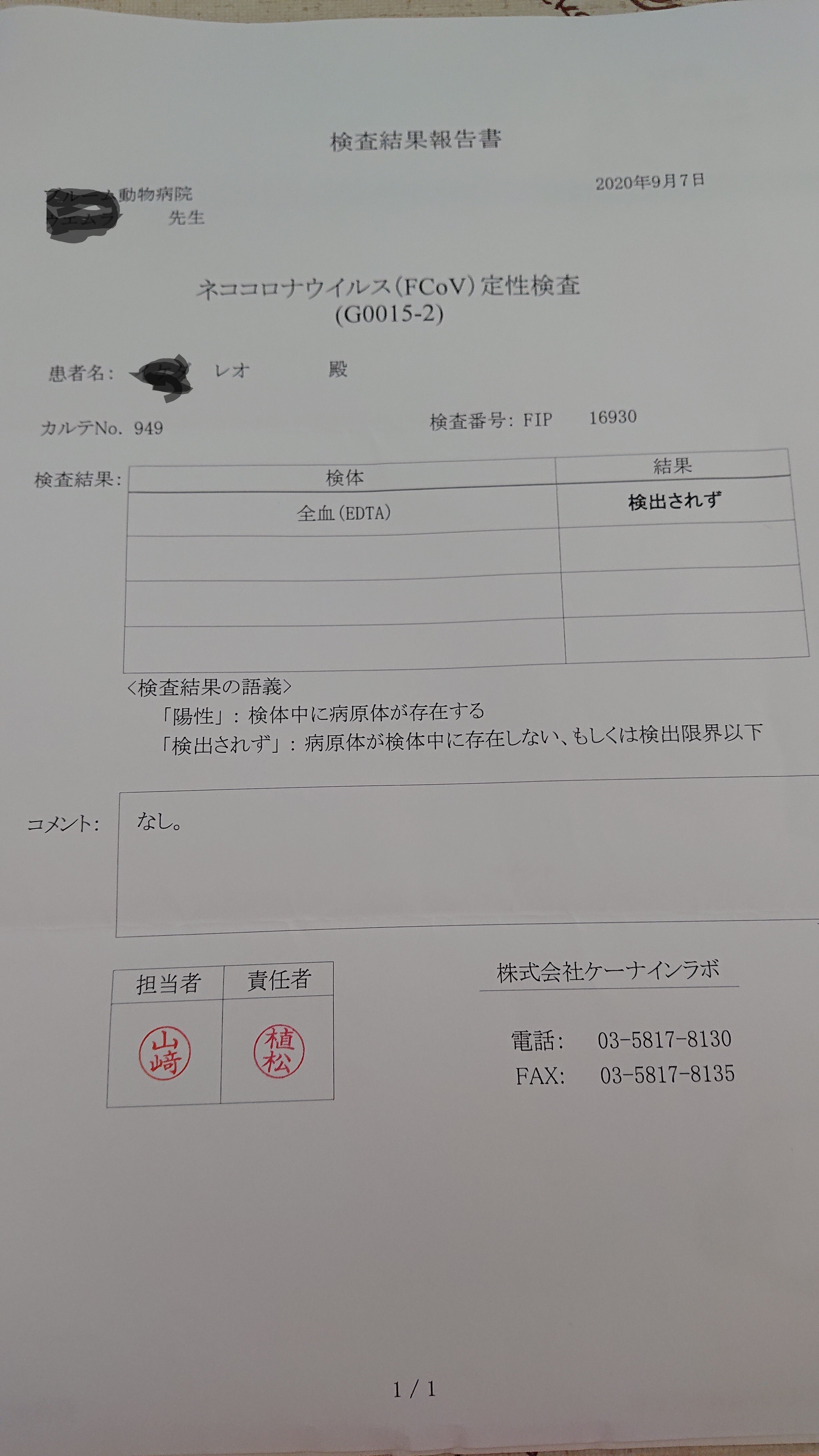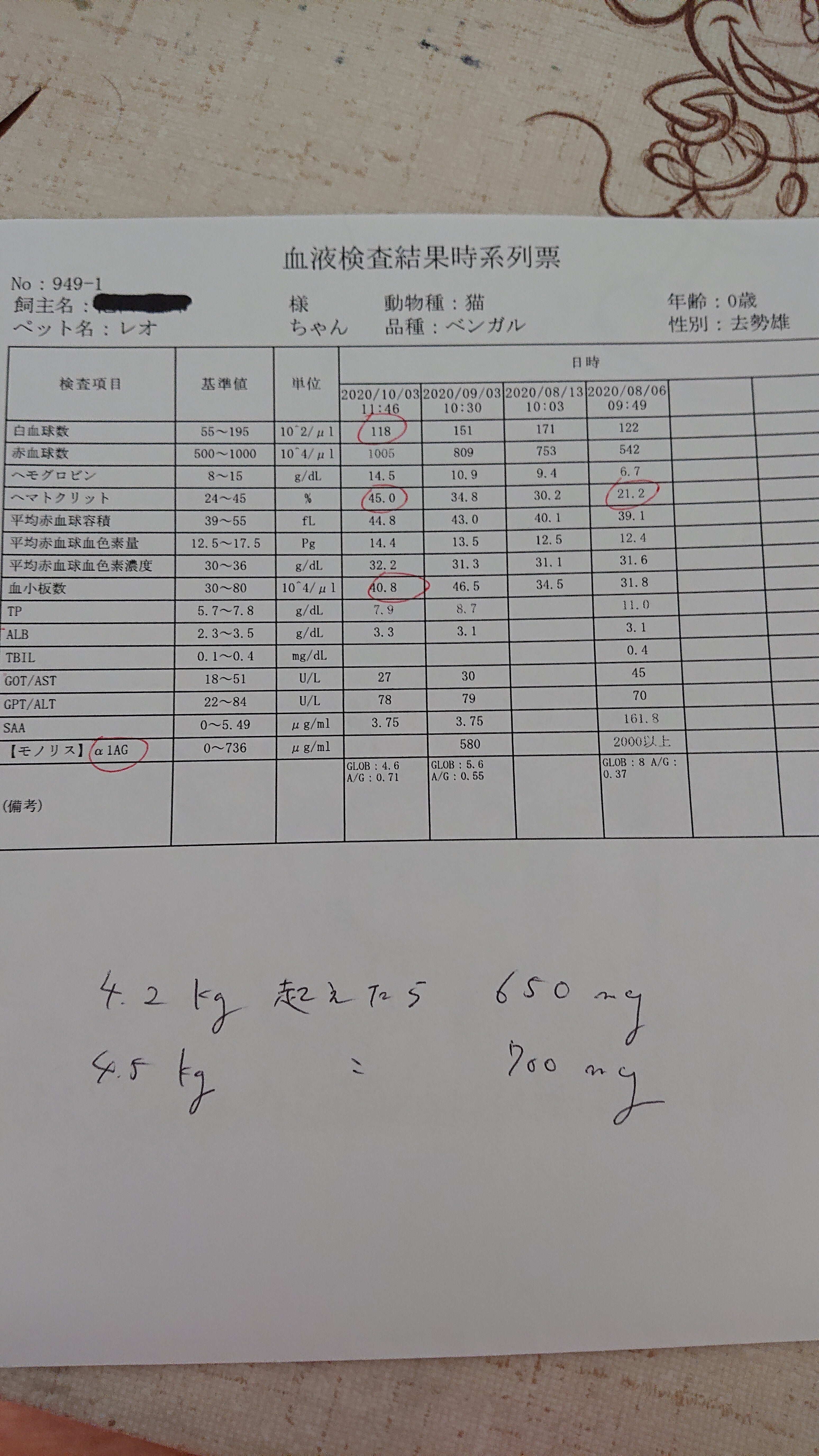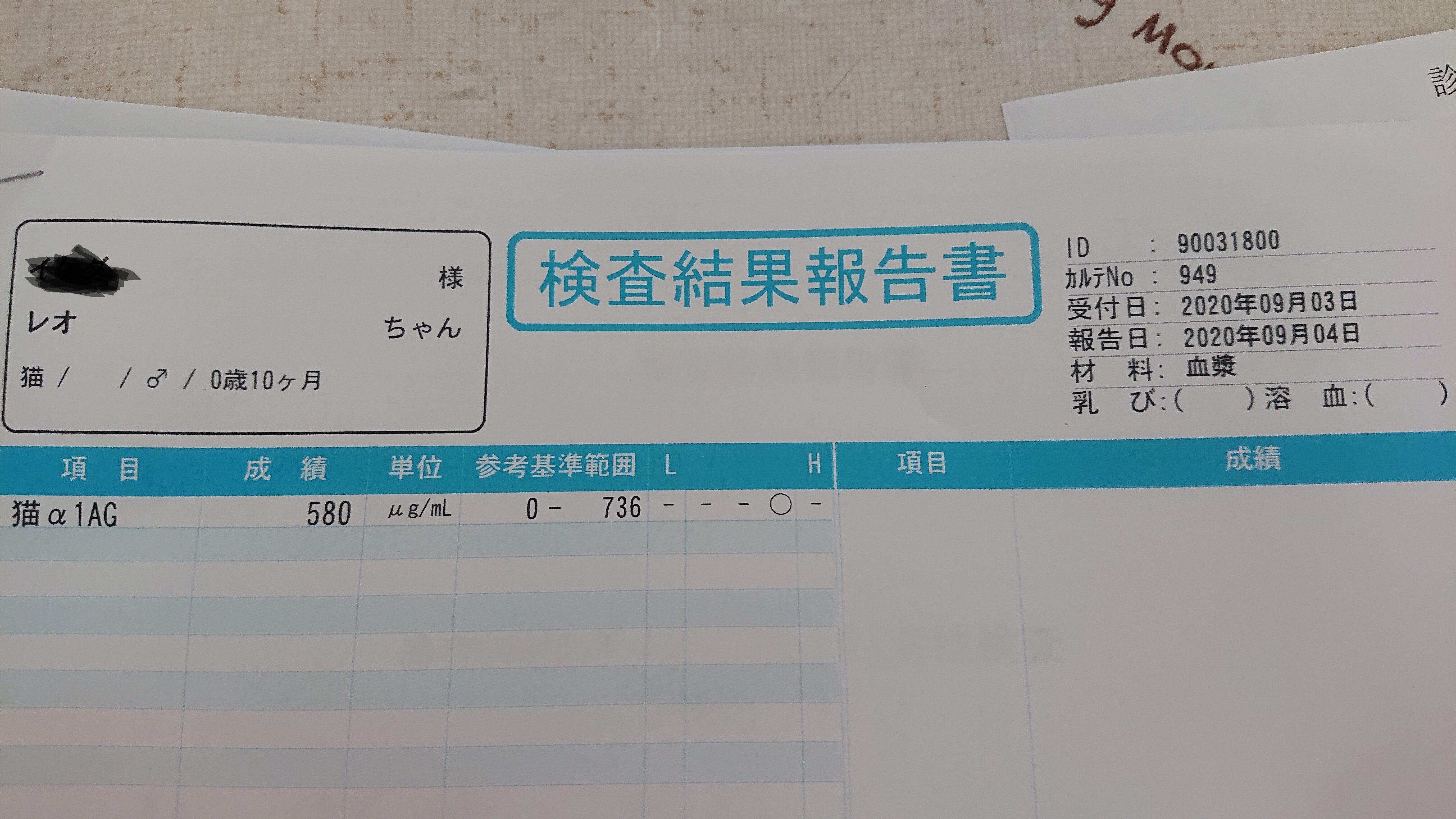 α1AGと猫コロナ検査の外注検査は今回は経過が良いので様子見で良い。次回10/24は必ず行い、投薬終了可で良いかどうか判断します。との事