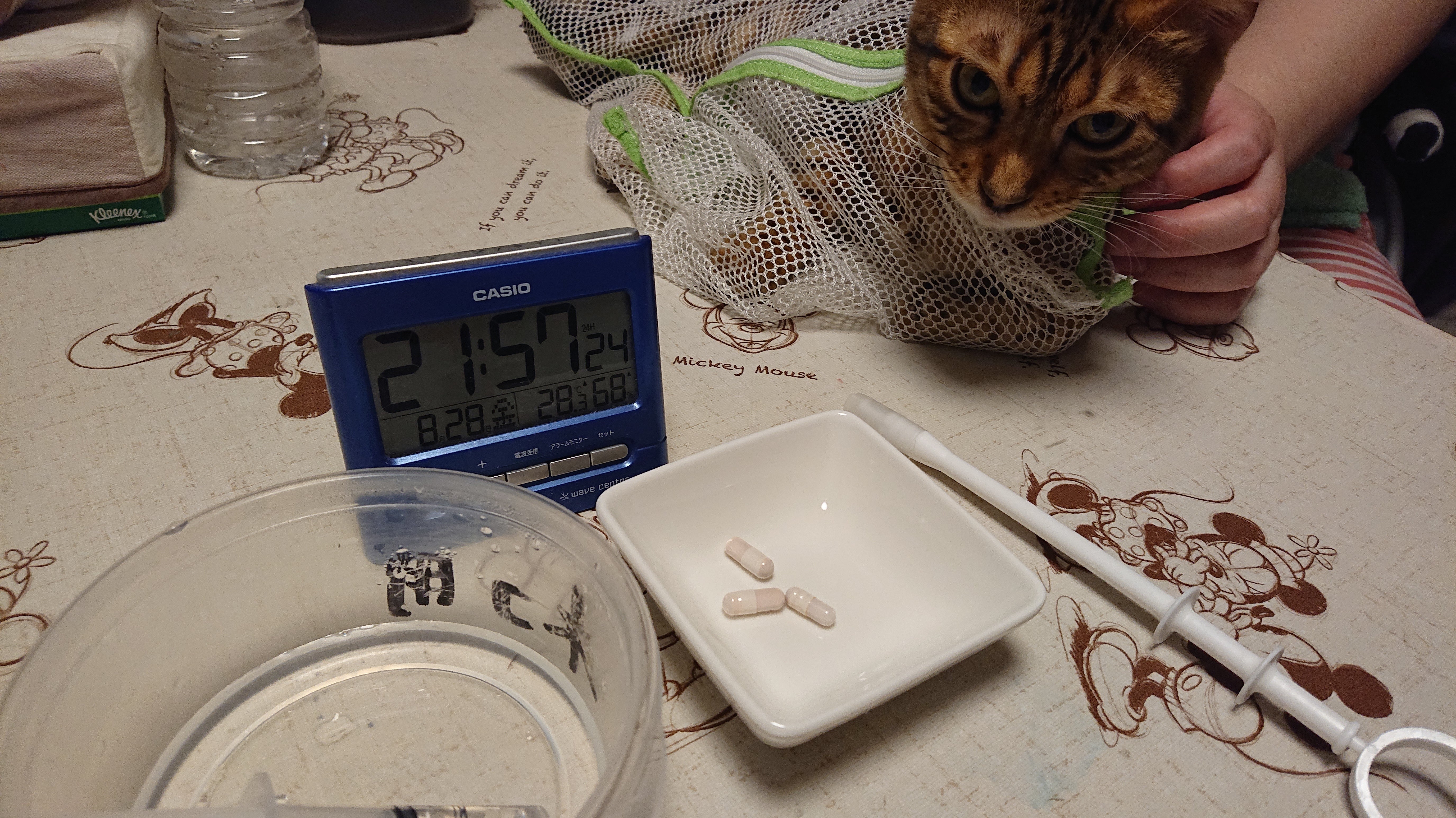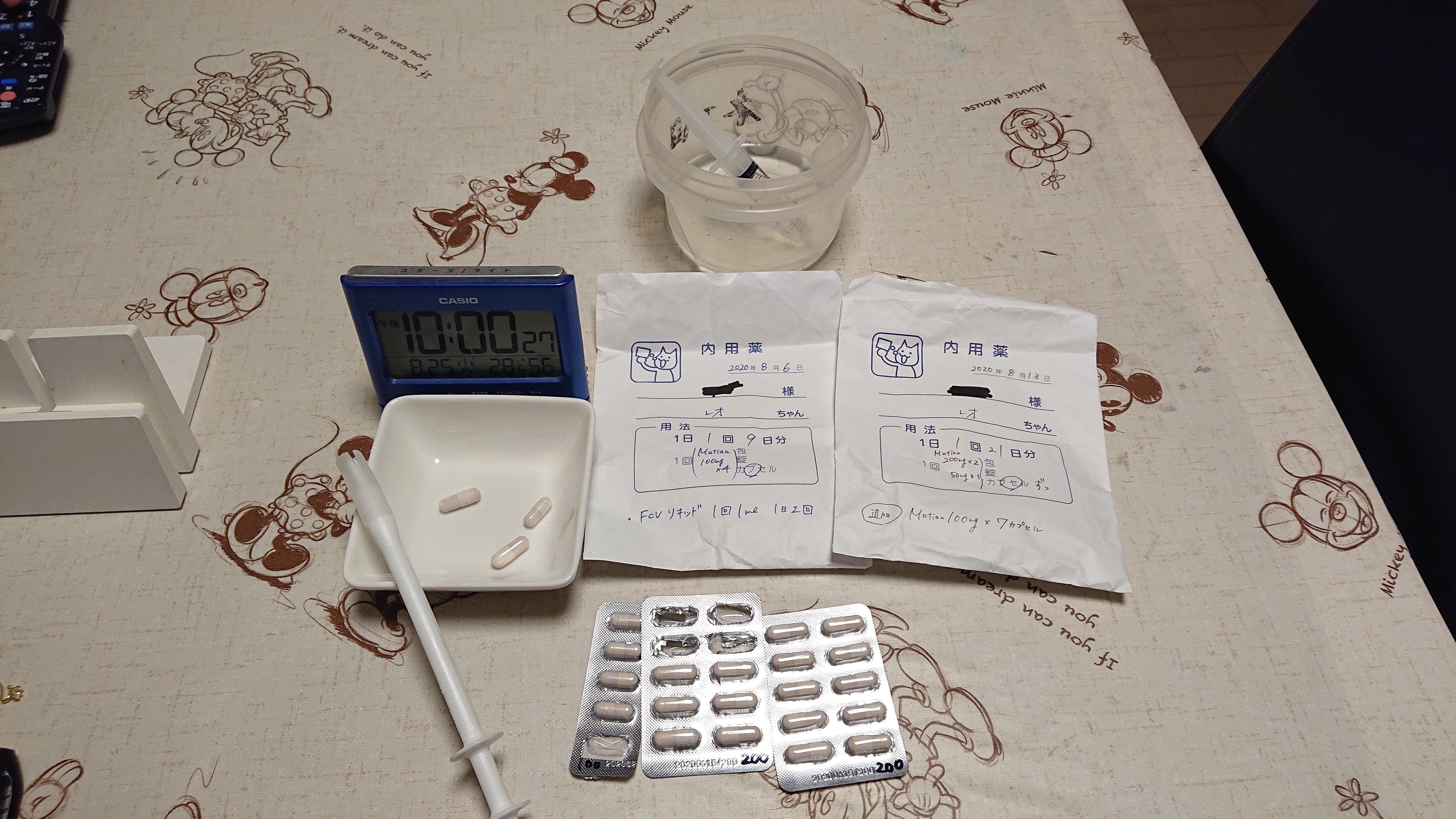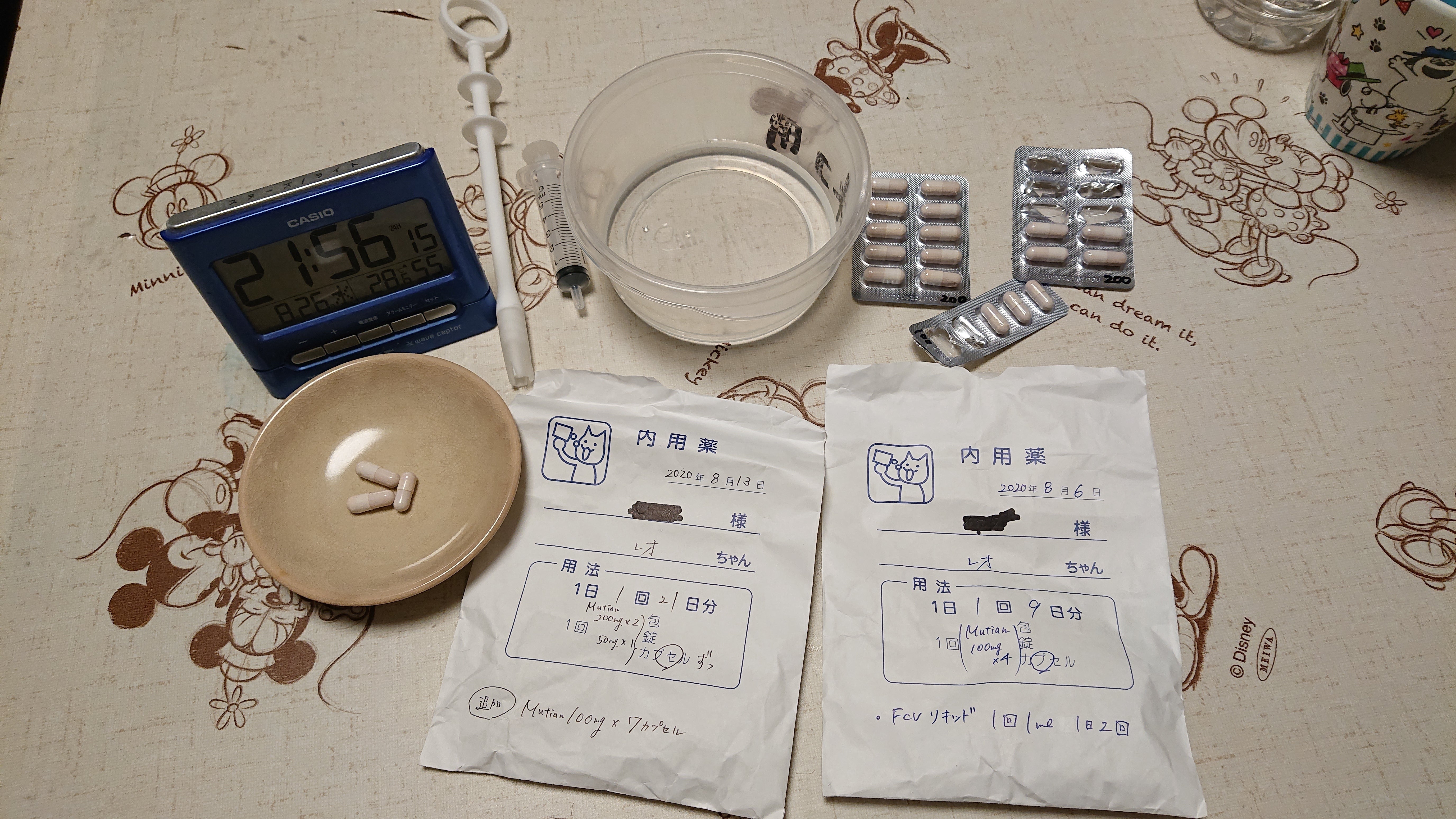 【8/25】投薬20日目22時 → MUTIAN 500mg体重3.2kg(レオの状態)活動、食欲旺盛食事は1日3回(10時半、16時、23時)本日は弟猫の病院受診で採血があったため、朝ごはん時間をずらしてます。排便1日1回、夕方頃に普通便あり。 本日も失敗することなく投薬出来ました。ここ最近、MUTIAN投薬1時間後ぐらいから、しっぽをホウボウにして興奮して走り回る様子あります。副作用に興奮作用があるのかどうかは分かりませんが、FIP猫ちゃん仲間の方に聞いたところ「投薬してから数時間後に興奮して走り回る様な症状が出ている猫ちゃんが、中にはいるみたいですよ。」とお聞きしたので、次回の受診(9/3)の際に、獣医師先生に話を聞くことにします。【投薬後のレオの様子】今日も少し不貞腐れていました。【支援様へ】本日も数名の方にご支援のご協力をしていただきました。本当にありがとうございます。心より感謝申し上げます。これからも頑張って参りますので、温かく見守っていたただけましたら幸いです。