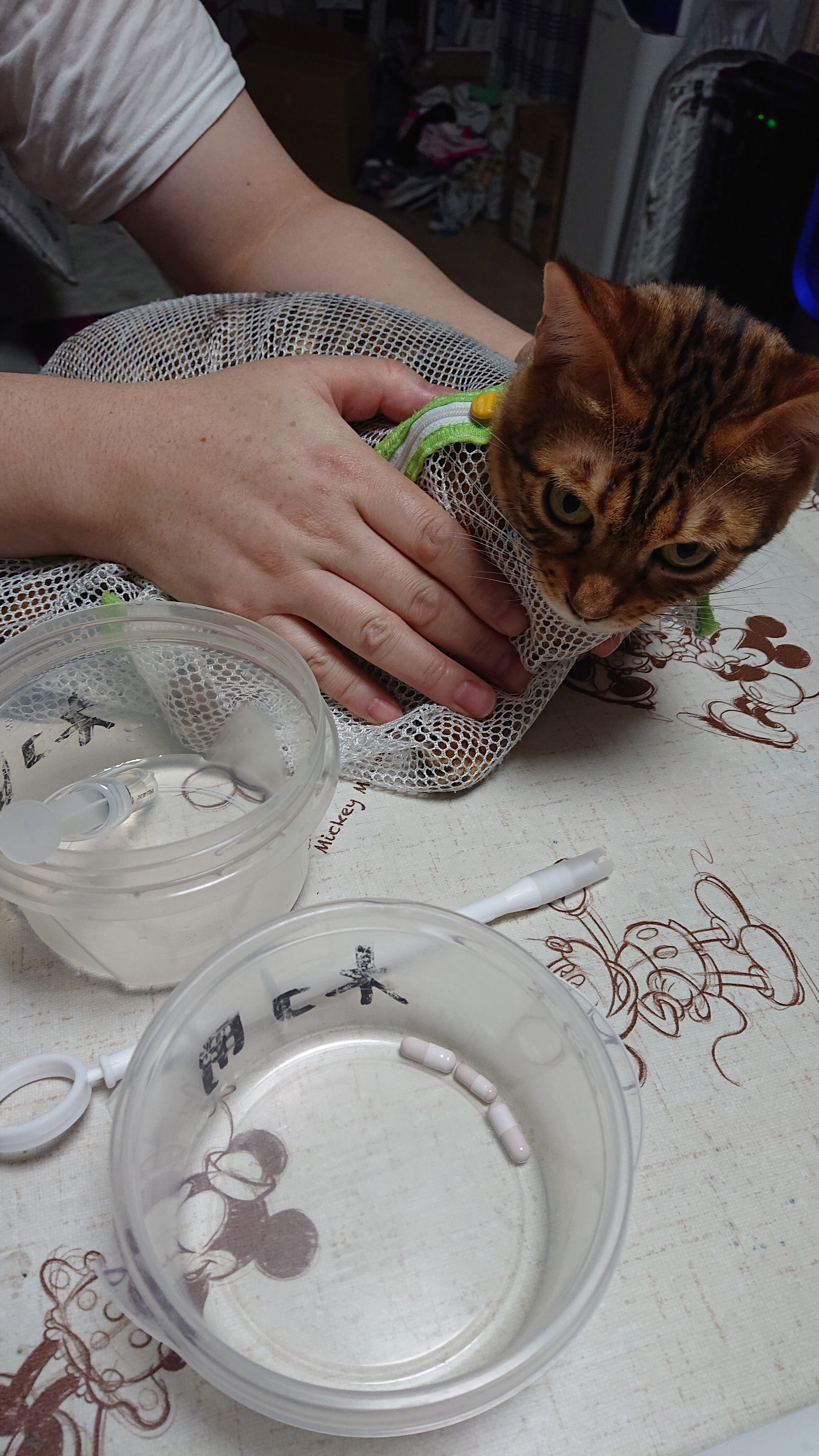 投稿内容とかぶるところがございますが、投薬開始の8/6から報告させて下さい。検査結果や領収書は本編投稿写真と一緒なのでここでは割愛させていただきます。ご了承下さい。次回の受診9/3なので、そこからは検査結果や領収書等の写真も投稿して行きます。【8/6】朝かかりつけ医にいただいたステロイド剤、抗生剤、整腸薬を内服食欲は少しあり、ウエットフードとちゅーるを食べる。午前9時にMUTIANを処方してくれる動物病院さんへ受診採血、エコー検査施行かかりつけ医での検査結果提出したため重複するものは割愛してくださる。FIPドライ型の中期と重度の貧血、3×6cmの肉芽腫、診断される。GLOB:8 A/G:0.37体重2.68kg1日、400mg投与との事抗生剤中止とプレドニン減量2日に1回を後三回やったら終了の指示とMUTIANと鉄剤の処方と説明を受けて、本日の22時から投薬することになる。ピルガンを使用し、400mg投薬スタートとなる。【8/7】朝・夕→鉄剤を1回1mg投与22時→MUTIAN400mg投与(レオの状態)昨日より元気になり、呼吸は普通に戻り(獣医師より、これはプレドニンの効果で腹水が減り始めたためとの事)食事も普通くらいの量を食べられる様になる。便はまだ小さくなるが粘液便が少なくなる。【8/8】朝→ステロイド剤1/2錠朝・夕→鉄剤を1回1mg投与22時→MUTIAN400mg投与(レオの状態)ステロイド剤の副作用もあり、食欲増進でご飯はしっかり食べられる様になる。便の量は増え、粘液便がほぼなくなる。走り回れる様になり、息切れも少ない。遊び始める。【8/9】朝・夕→鉄剤を1回1mg投与22時→MUTIAN400mg投与(レオの状態)食欲旺盛になり、毛並みが良くなる。便はMUTIANの副作用かちょっと柔らめだが、普通便になる。遊んだり、走り回ったり、弟猫と遊ぶ様になる。【8/10】朝→ステロイド剤1/2錠朝・夕→鉄剤を1回1mg投与22時→MUTIAN400mg投与(レオの状態)食欲旺盛、体重は2.7kgへ便は普通になる。息切れなくなり、良く走り回り、遊び、お腹を上に向けて寝るようになり、お腹を触っても嫌がらなくなる。【8/11】朝・夕→鉄剤を1回1mg投与22時→MUTIAN400mg投与(レオの状態)食欲旺盛、見た目では普通の健康な子猫と変わらない程に活発に動き回る便の状態も良好【8/12】朝→ステロイド剤1/2錠(本日で終了)朝・夕→鉄剤を1回1mg投与22時→MUTIAN400mg投与(レオの状態)食欲旺盛、活発、便も良好体重が2.8kgに増える。【8/13】受診日朝→鉄剤を1回1mg投与22時→MUTIAN450mg投与10時に動物病院へ採血施行貧血は改善され、鉄剤は夕より中止体重が2.86kgへ増えたのでMUTIANは450mgへ増量次回受診で採血とエコーを行い肉芽腫とA/Gの確認を行うとの事体重とMUTIAN量の説明をうける。2.8kg超えたら→450mg3.2kg超えたら→500mg次回の受診は9/33週間分のMUTIAN処方される。【8/14~8/17】22時→MUTIAN450mg投与(レオの状態)食欲旺盛、活発に活動できる、便も良好で1日2回普通便になる。【8/18~8/23】22時→MUTIAN450mg投与18日から毎日体重測定施行食欲旺盛、活発、便も良好体重が3.1kgに増える。次回の受診まで、活動報告では投薬の様や日々のレオを写真付きで報告しています。【支援者様へ】クラウドファンディング立ち上げ早々にも関わらず、レオの為にご支援のご協力をいただきありがとうございました。支援者の皆様の温まるお言葉に涙し、このコロナ大不況の中、ご支援いただいたこと、夫婦共々、心より感謝申し上げます。本当に本当にありがとうございました。今後も活動報告して行きますので、温かく見守っていただけたら幸いです。よろしくお願いいたします。