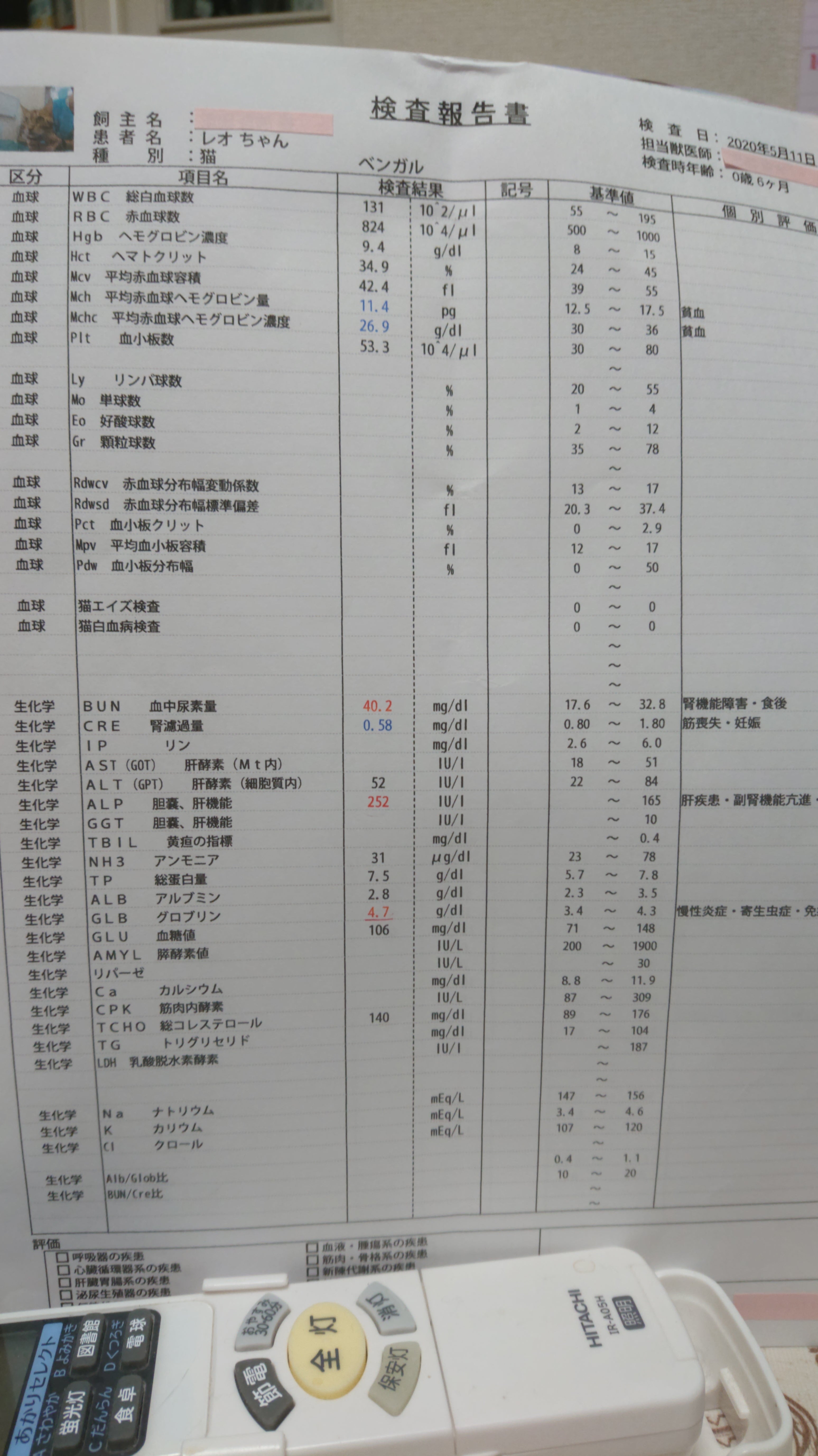 2020/11/28 18:09【病院受診】本日は投薬終了後1ヶ月後の受診でした。(経過観察31日目)11時に動物病院到着。獣医師に1ヶ月の様子を報告する。元気も食欲もあり、排泄も問題なし。ただ、良くくしゃみをするのが気になると報告する。くしゃみの回数が多く鼻汁が黄色の様なものなら猫風邪と思われるが、現在のレオは特に肺の音も問題ないし、目も鼻も綺麗だと、また成猫になったので猫風邪もよほどの事がないと酷くはならない、水っぽい鼻水やくしゃみが時々の頻度の時はアレルギー(花粉やハウスダスト)の可能性の方が高いですとの事でした。体重測定、血液検査、エコー検査施行する。体重 5.06 kg【血液検査結果】白血球、ヘマトクリット、ALB、GLOB、A/Gは問題なし。TPが若干高いが、猫風邪等でも上がる。体重減少、活動力の低下がない様子なので、心配しなくても大丈夫です。ただ、今後に体重減少や食欲不振などが見られた場合は要注意なので直ぐに受診するようにとの事。前回のコロナウイルス検査結果は問題なし。今回も検査は行い、結果が出次第電話で報告するとの事。【エコー検査検査】特に腸に肉芽腫は見られず、他の臓器も問題なし。血液、エコー検査結果からして、経過はまずまず良好ですとの診断でした。TPが若干高いのが気になりますが、経過は良いとの事でホッとしてます。本日の診療明細は、以下の写真の通りです。次回の受診は2ヶ月後の予定(2021.1.23受診予定)です。2ヶ月後の受診で結果が良ければ寛解となりますとの事でした。2ヶ月後の受診で寛解と言ってもらえる様にしっかりレオを看て行きたいと思います。本日も車の中でも、お利口さんなレオでした。↓【支援者の皆様へ】いつもレオを応援してくださり、また温かく見守って下さって本当にありがとうございます。心より感謝申し上げます。レオは元気に過ごせています。リターンの返礼について、一部の方以外はほぼ終わりました。一部の方ですが、5,000円以上のご支援のご協力をしてくださった方で、住所の記載なくリターンの返礼品は不要との事でしたが、規定通りの返礼品の準備をしてあります。主人の方からメールを送らさせて頂きましたので、よろしければメールをご確認して頂き、お手数おかけしますが返信下さると幸いです。本当にありがとうございました。これからもよろしくお願いいたします。池田 敦子 もっと見る活動報告【10/29】経過観察期間に入りました
