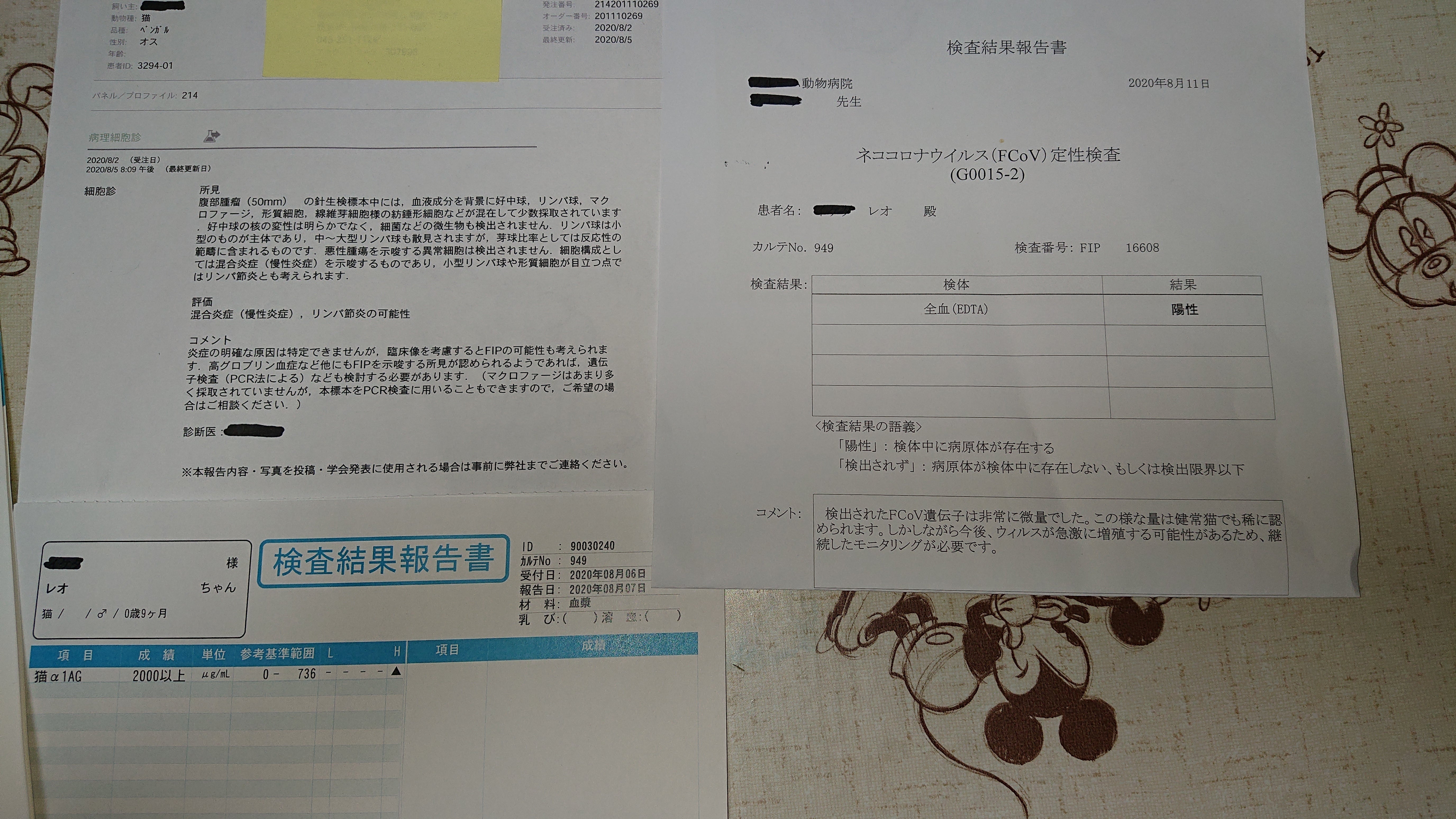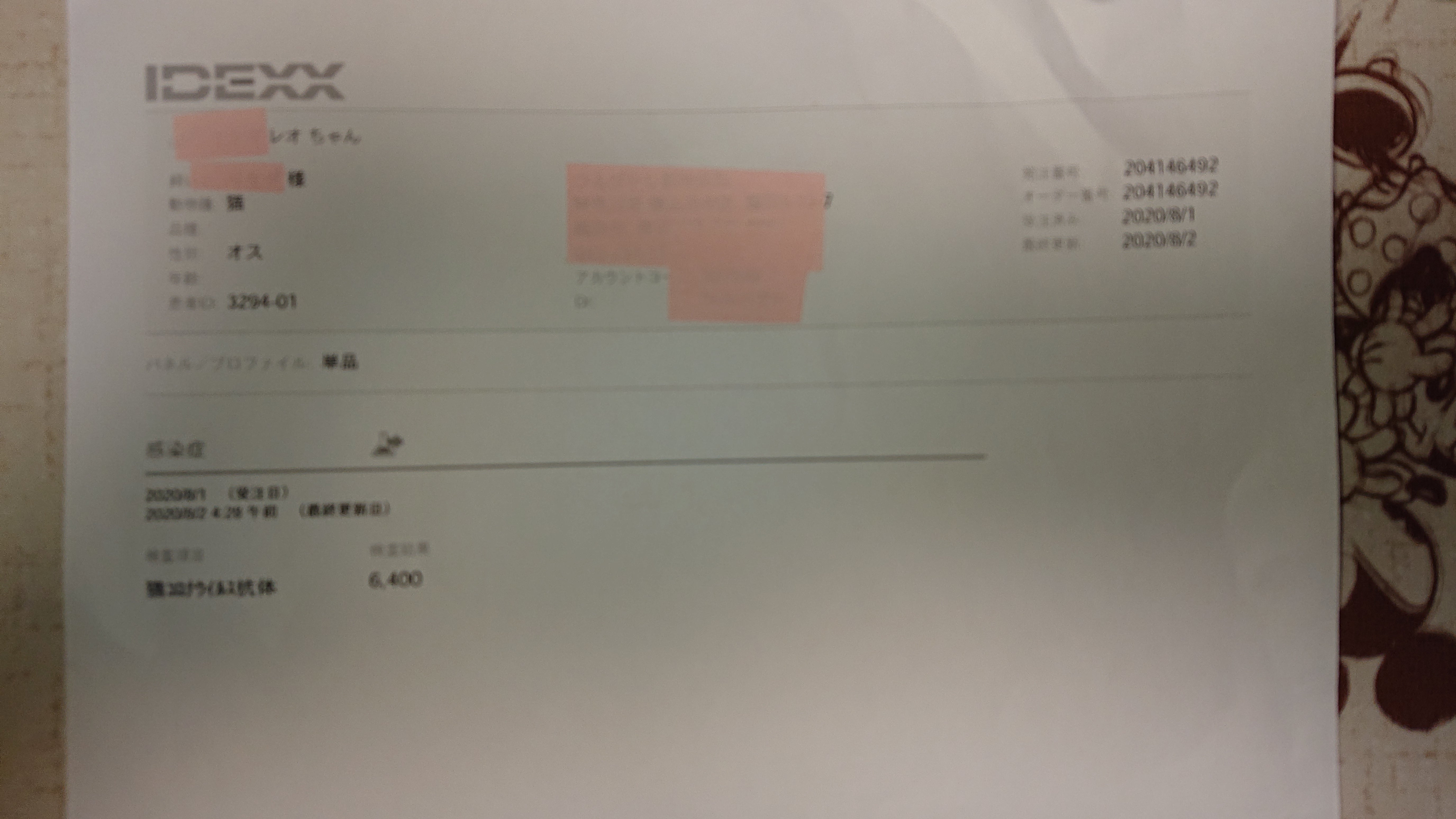そして、8月4日にコロナウイルス抗体検査の結果が先に出たと連絡が入り、抗体が6400とかなり高値でほぼFIPに間違いないでしょうと言われました。
