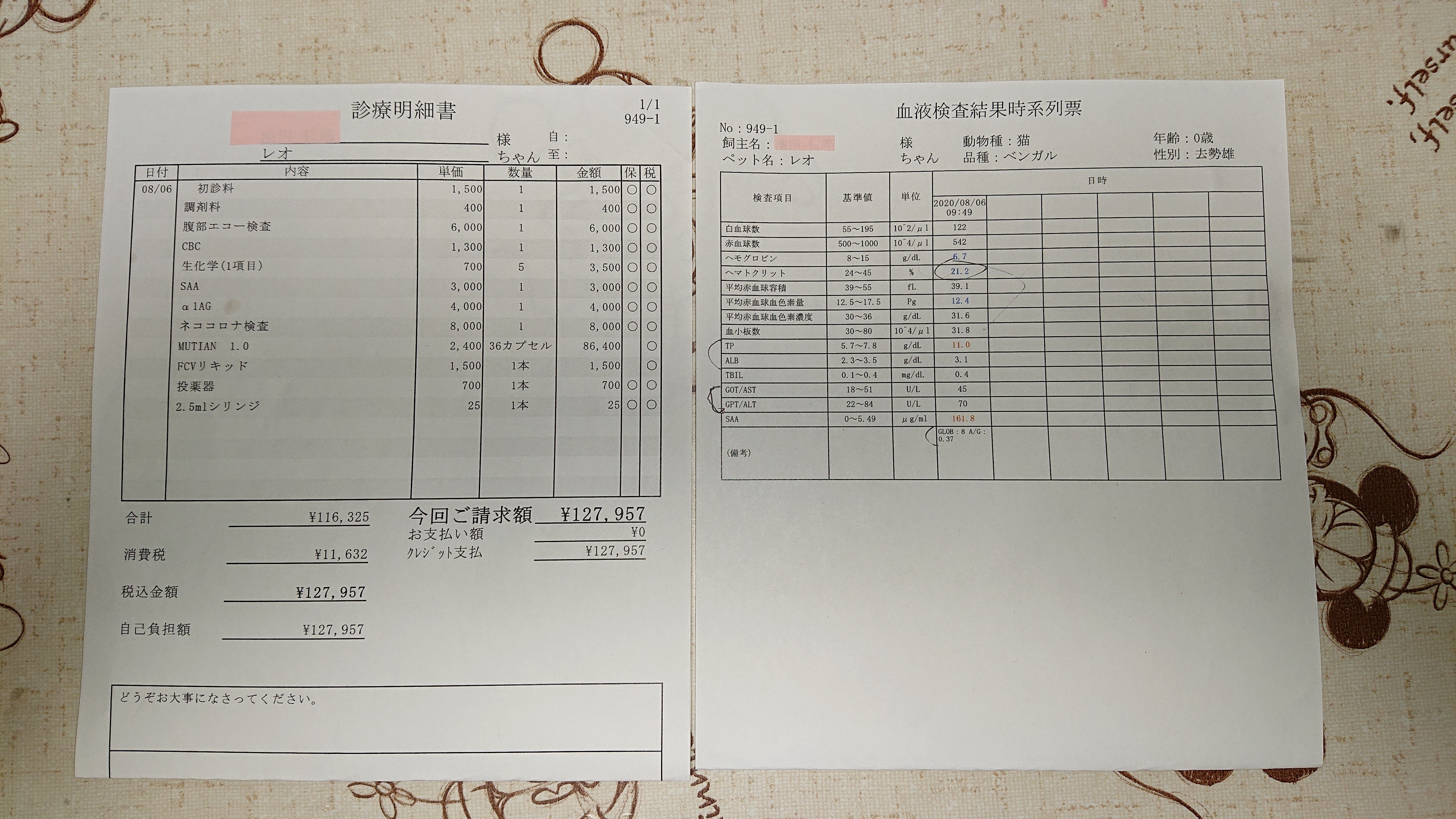 (かかりつけ動物病院と現在MUTIAN治療でかかっている動物病院合わせてます)