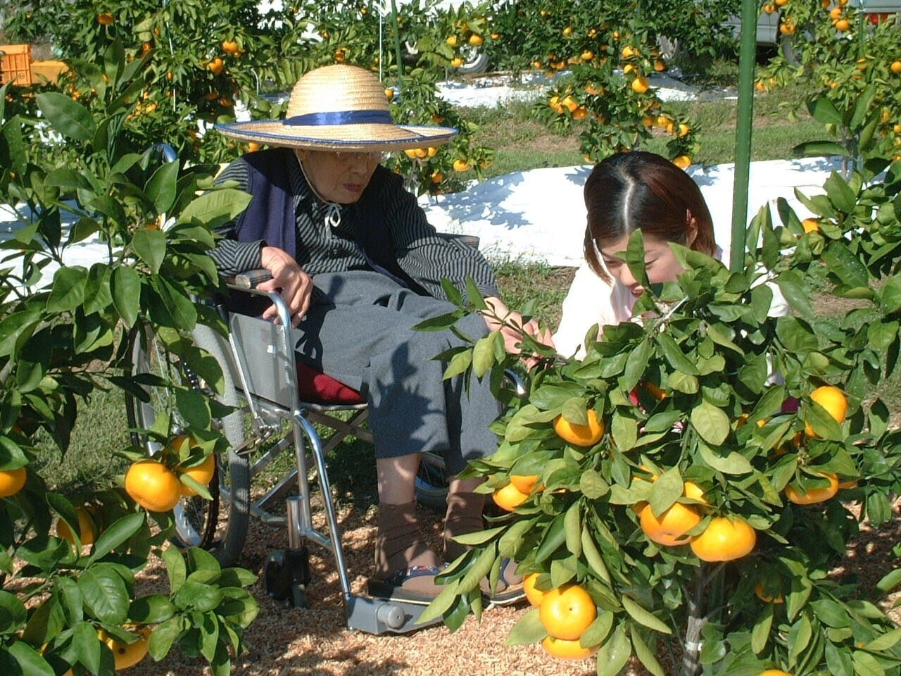 バリアフリーな畑を作り、車椅子の方々が行ったみかん狩り風景