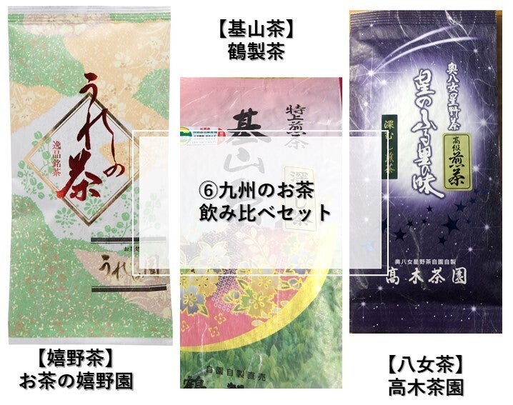 九州には数多くお茶の産地がありますが、今回はいつもファーマーズマーケットに出店している「高木茶園」さんの八女茶、「鶴製茶」さんの基山茶、「お茶の嬉野園」さんの嬉野茶を一度に楽しむことができる飲み比べセットをご用意しました!