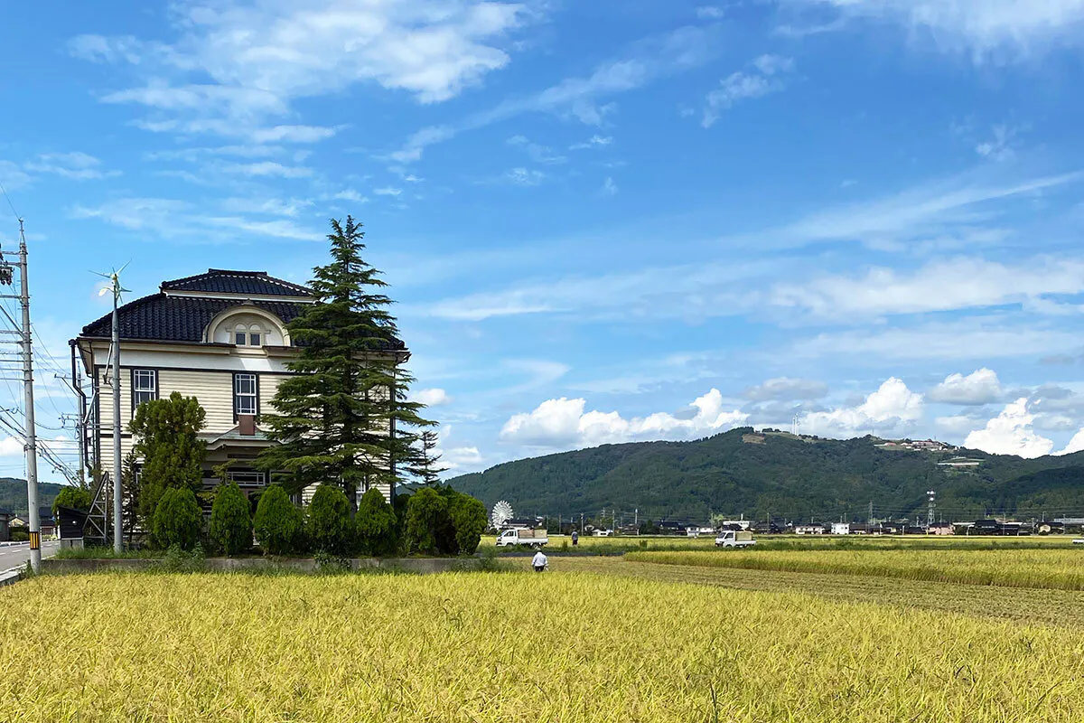 旧宮島村役場を写真に撮ろうと思っていたら、一足遅く、稲刈りが始まってしまっていました。