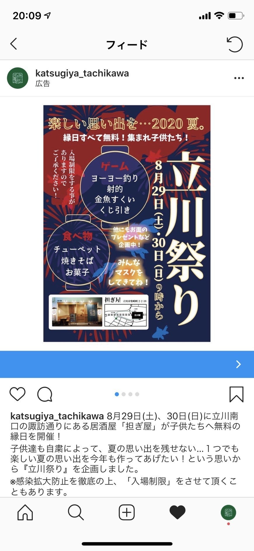 昨日お伝えしておりましたInstagramの広告が、立川、昭島、国立、東大和、武蔵村山の地域で開始されました!皆さんの所にも現れるかも…!『立川祭り』の広告が出てきたらチェックしてみてください!