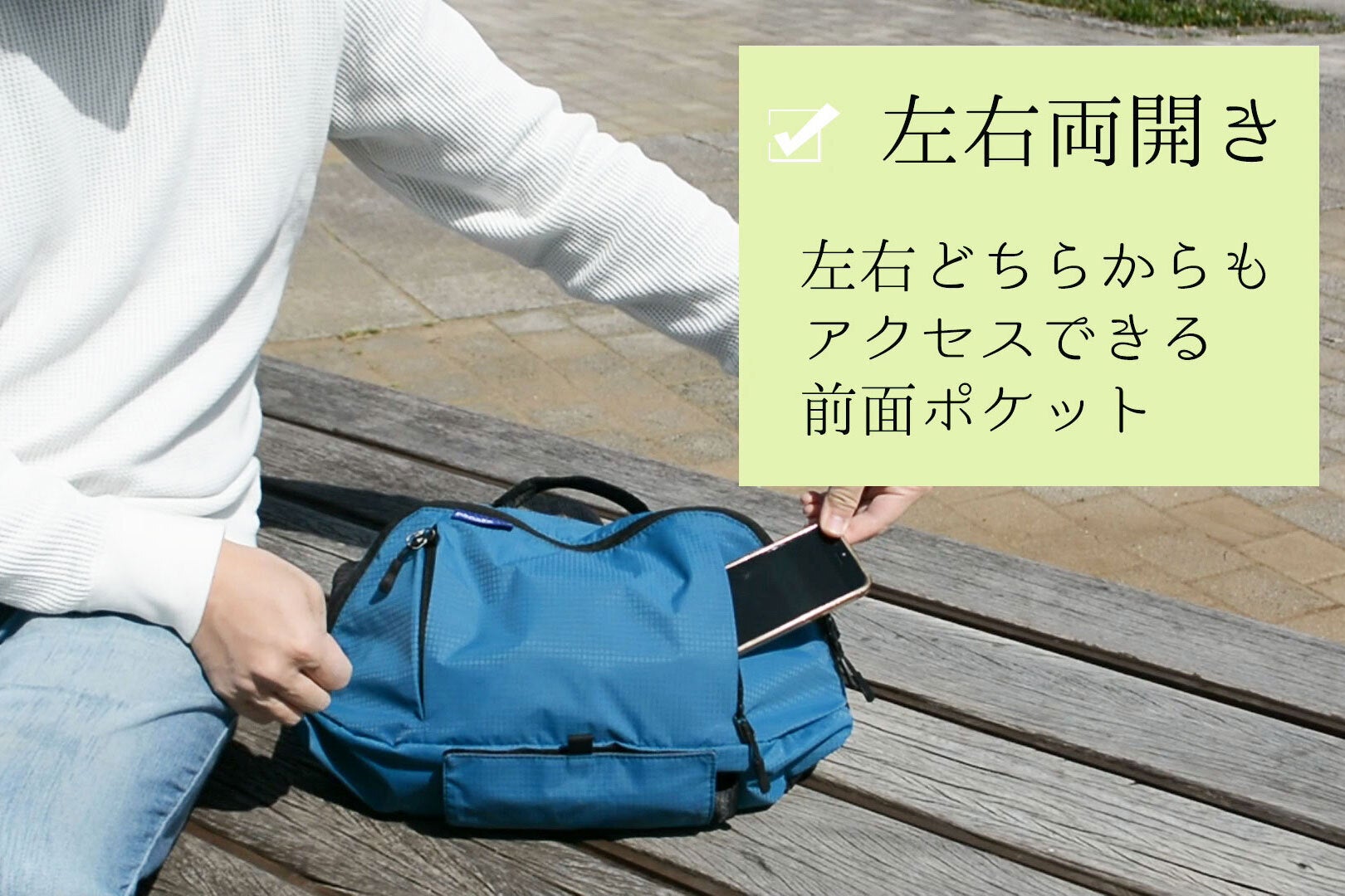 (3)前ポケットは左右どちらからもアクセスできる両開きタイプ。