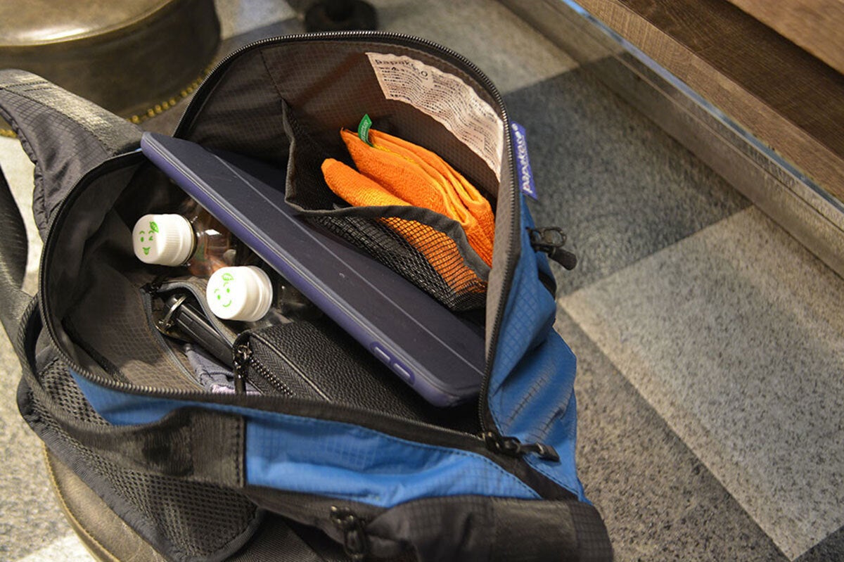 子ども用のペットボトル2本と、財布、タブレット(iPad)とハンカチなど。タブレットは10.2インチや、サーフェスのlaptopGoが入ります。