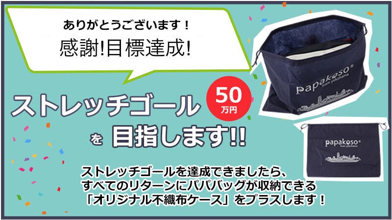 ストレッチゴール50万円を達成できた場合には、パパバッグが収納できる「オリジナル収納ケース」をすべてのリターン特典に追加させていただきます。 尚、当プロジェクトで得た資金は、パパバッグキャリアーモデルの広告宣伝費用および量産費用などの一部に充てさせていただきます。