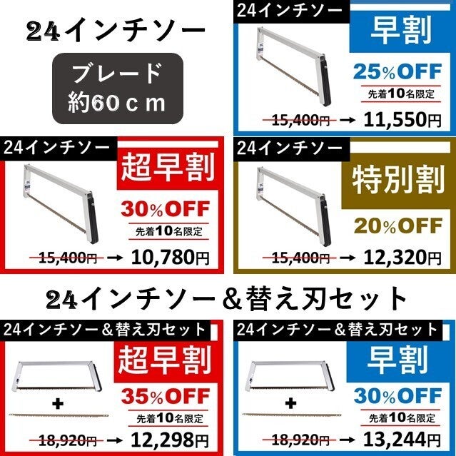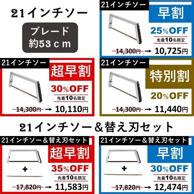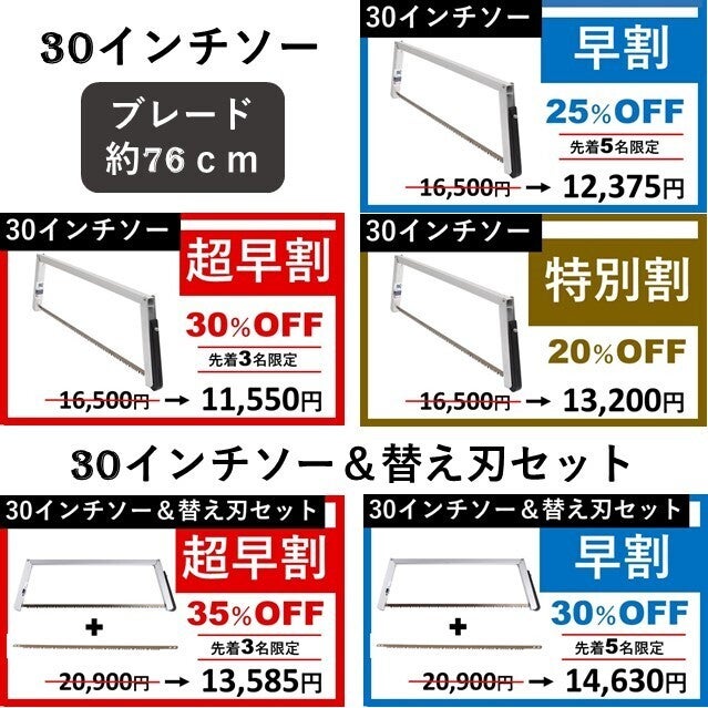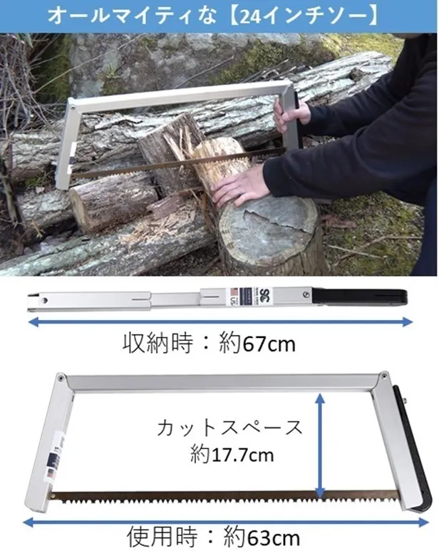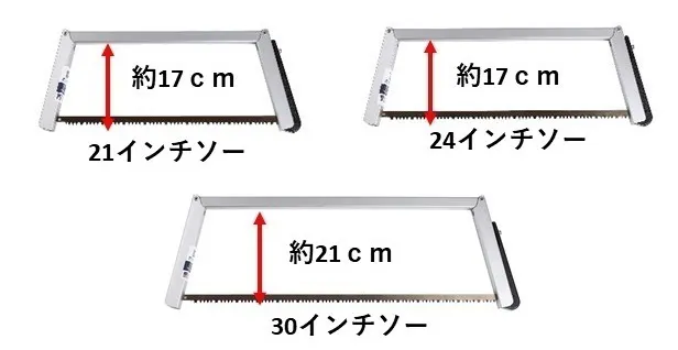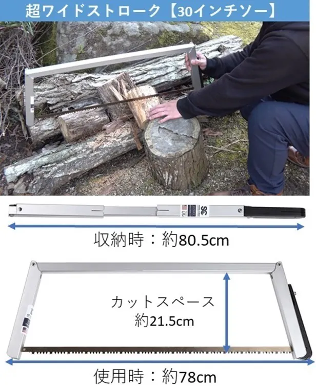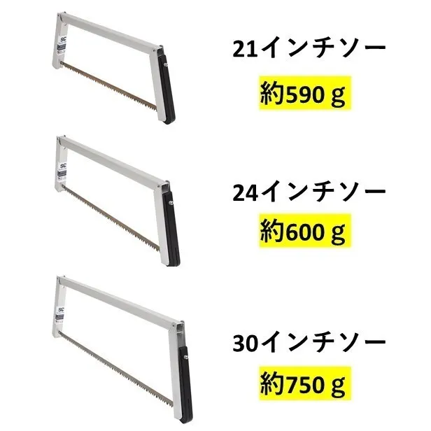 ソロキャンプに最適な21インチソーは約53cm、ミドルモデルの24インチソーで約60cm、ロングモデルの30インチソーは約76cmの鋸刃が付属しており簡単にセットアップが可能です。