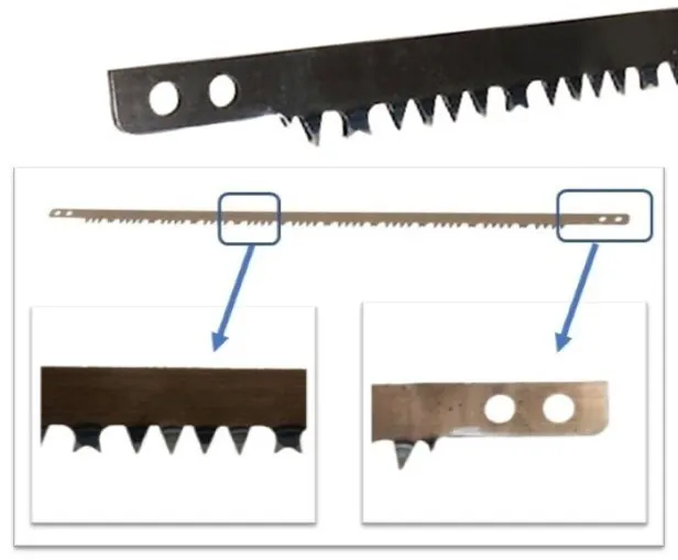 A.鋭利な刃物になりますので、取り扱いの際には皮手袋を着用するなどケガのない様十分に気を付けてご利用ください。また、鋸刃の折れ・欠けの原因にもなりますので、鋸刃を収納する際にはフレームに鋸刃が当たらないよう慎重に収納してください。