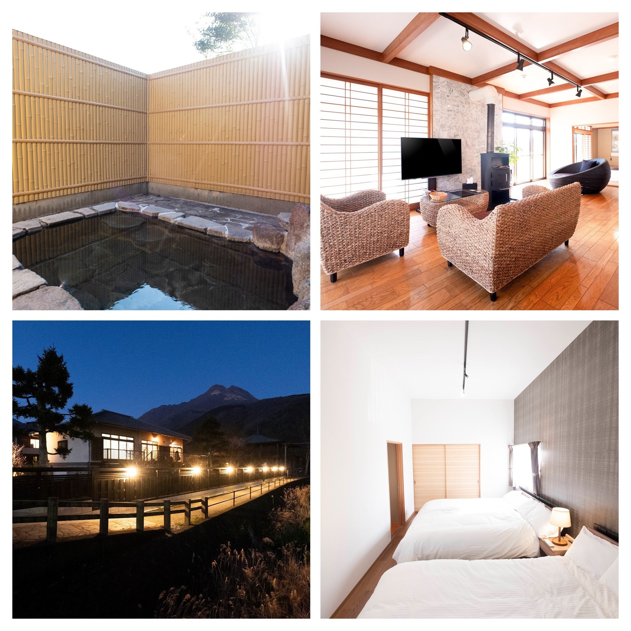 私たちは、2名で事業をスタートいたしました。「別邸Gensen」は、2020年3月にオープンした1軒目の宿です。はなれの温泉と広いお庭の付いた1棟貸しの宿です。温泉旅館のような手厚いサービスやお食事こそ付いていないものの、10人泊まれる広さ、観光名所の湯の坪街道や金鱗湖まで歩いて5分の好立地ということもあり、多くのお客様を迎えてきました。