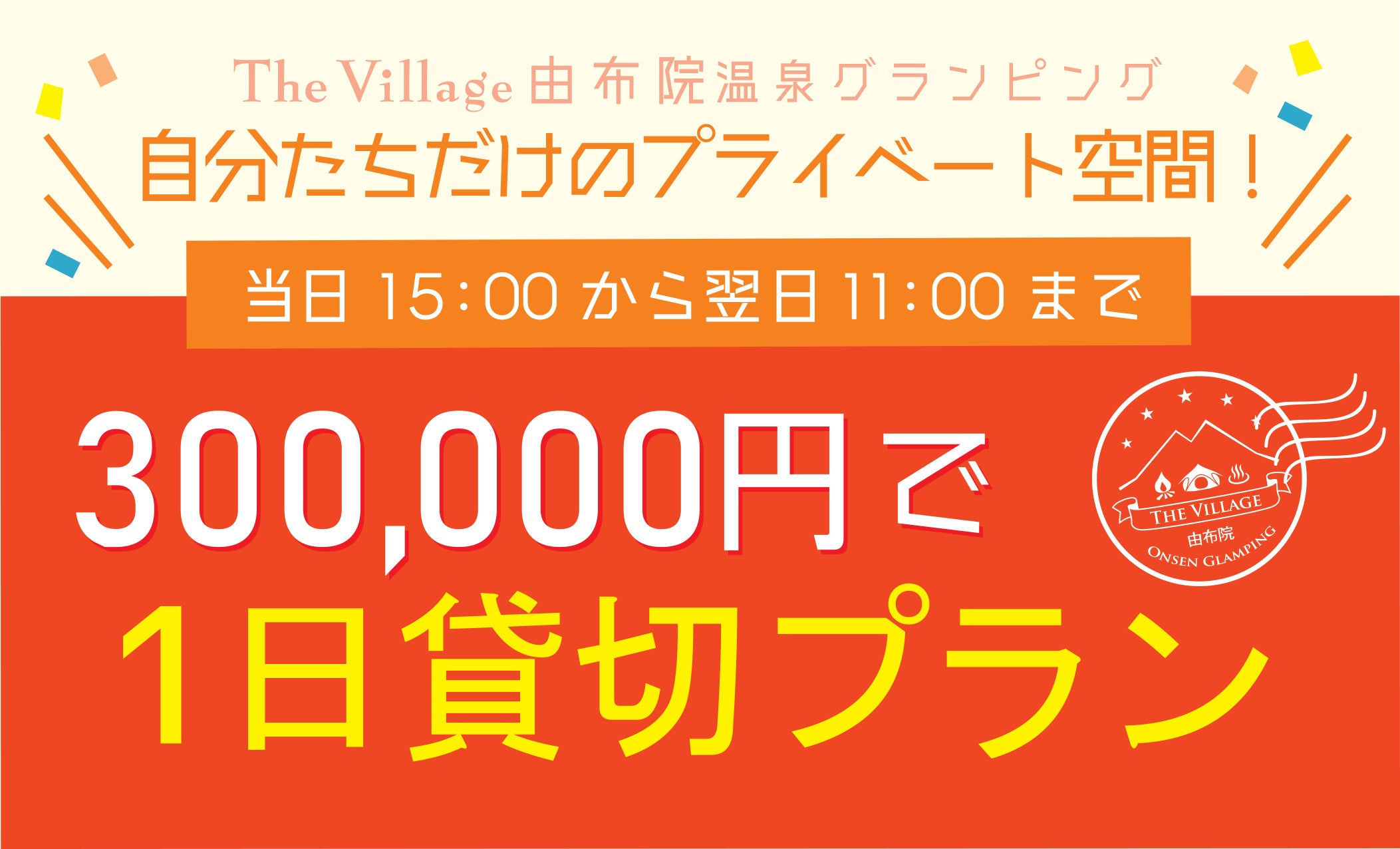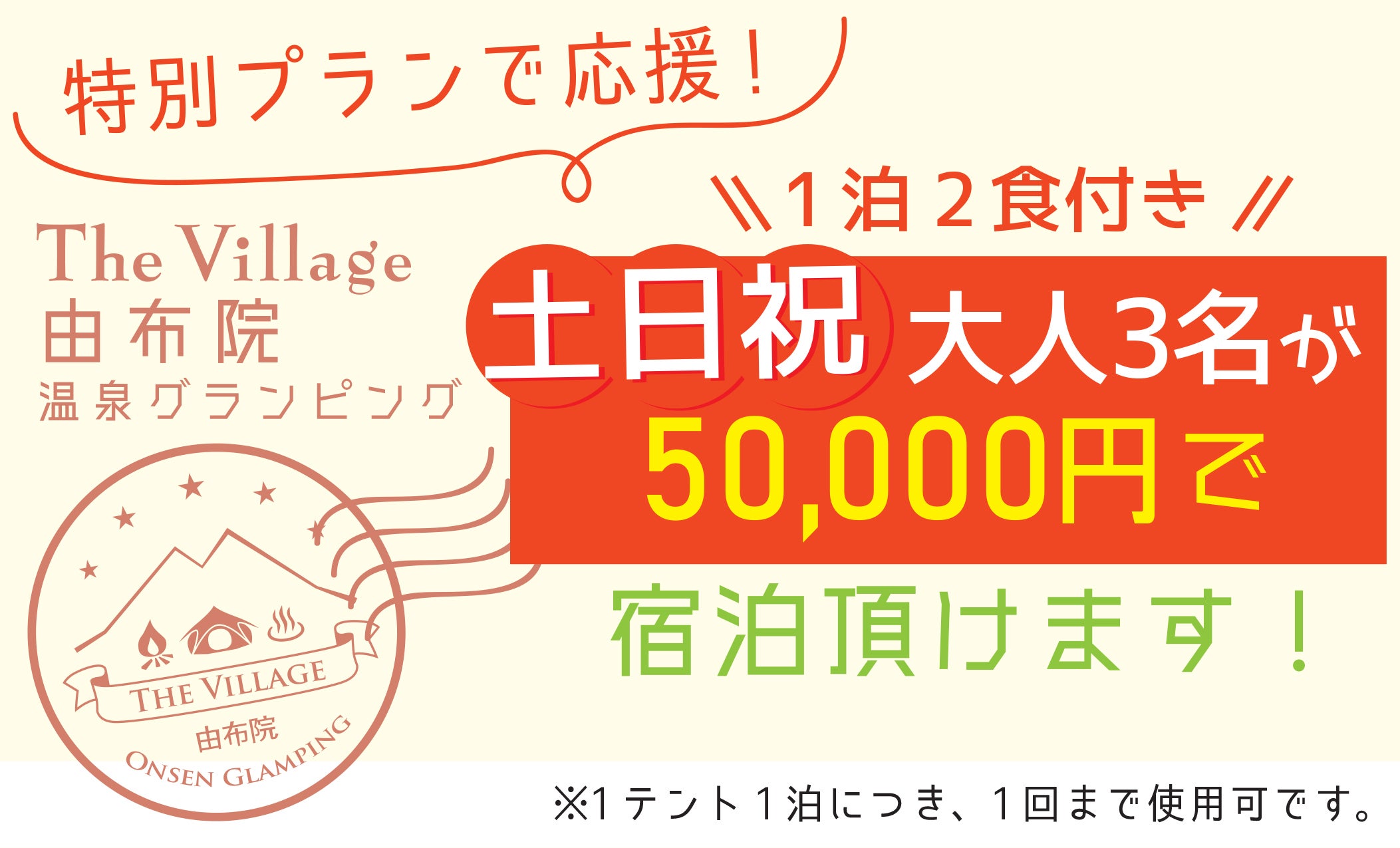 ・300,000円…【The Village 由布院 1泊貸切で応援プラン】当施設を1日貸切出来るリターンです。テント5張り、1泊2食、チェックイン15:00~チェックアウト11:00で、自分たちだけの完全プライベート空間にしていただけます。有効期限:2020年11月1日~2021年10月31日