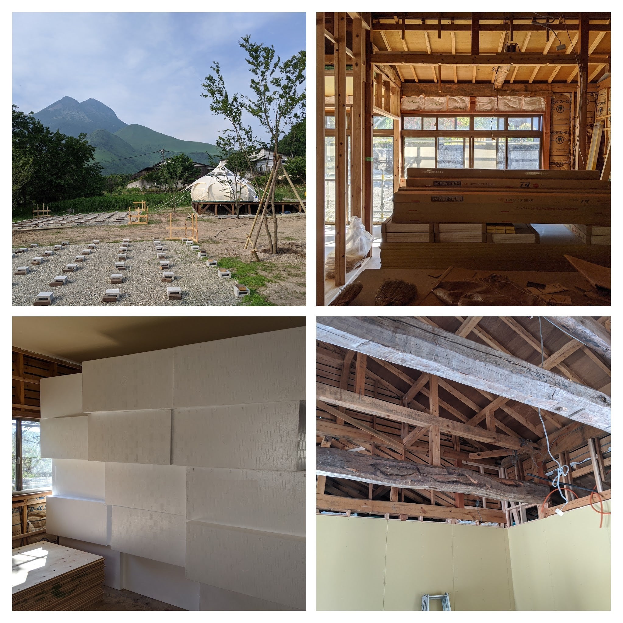 温泉、トイレ、マルシェを有するクラブハウス。外には、大きなロータスベルテントが5張り。比較的こじんまりとしたグランピング施設です。一緒に働くメンバーも増えました。また、同時にこのプロジェクトは、たった1軒の宿をやっている私たちにとって、ちょっと背伸びしたくらいの投資が必要でした。
