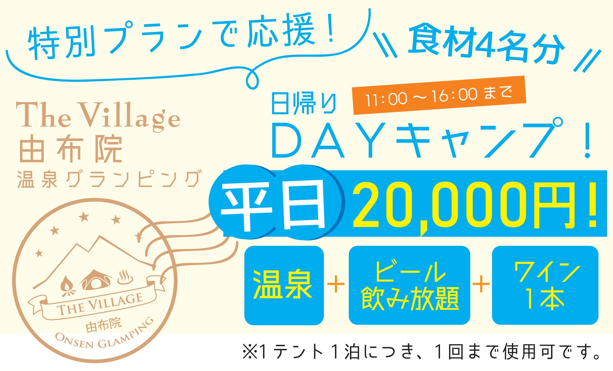 ・20,000円…【平日日帰り温泉ランチBBQで応援プラン】DAYキャンプを体感いただけるリターンです。11:00~16:00の間、グランピングサイトでランチBBQを楽しんでいただけます。4名様分の食材に、今回は特別にワイン1本とビール飲み放題が付いて、温泉にも入れるお得なプランです。※大人1名5,000円、子供1名3,000円で追加可能です。未就学児は無料(食事なし)です。後日、送付させていただくURLのサイトよりご予約いただけます。有効期限:2020年11月1日~2021年10月31日