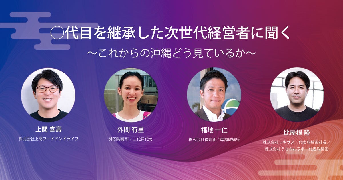 沖縄では、2代目、3代目として事業を引き継いだ経営者が数多くいます。中でも、「今までやってきたことをそのまま受け継ぐのではなく、アップデートする」若手経営者たちが注目を集めています。そんな2代目、3代目を継ぐ沖縄県内の若手経営者たちが登壇し、「なぜ事業を継ごうと思ったのか」「事業承継の魅力と大変さ」「これからの沖縄の可能性」などについてざっくばらんに語ります。