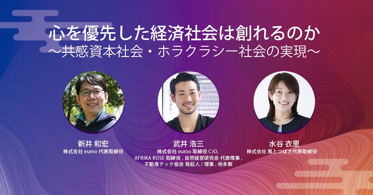 経済社会の新しい形を創ろうと実践している登壇者をお招きし、「そもそも共感資本社会とは」「ホラクラシーで何が実現できるのか」「どんな社会を目指しているのか」といったことを語っていただきます。