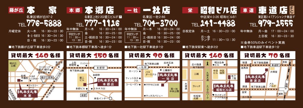 (我楽多文庫栄店(昭和ビル)、藤ヶ丘店(本家)、本郷店、一社店、車道店)