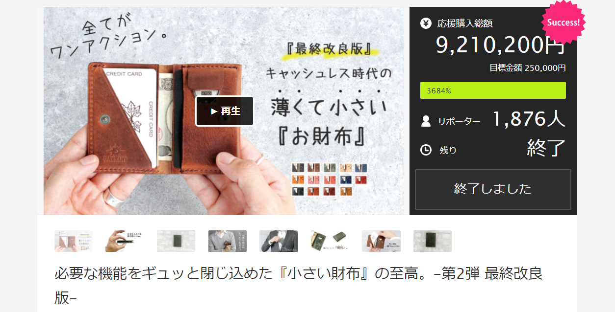 2021/02/12 15:56「必要な機能をギュッと閉じ込めた『小さい財布』の至高。最終改良版」プロジェクトオーナーのASIANARTSです。①【CAMPFIRE会員様限定:10%OFF】[小さいお財布]×1点 5300円 ※上記お待ち頂いて一部のご支援者様(ダークグリーン) のリターン商品発送が本日完了致しました事、ご報告させて頂きます。この度は予定の納期が遅れてしまい、本当に申し訳ございませんでした。納期が遅れてしまいました全て方へ粗品ではございますが、同じ革を使用したキーホルダーをご用意させて頂きましたのでリターン品と一緒に送らせて頂きます。上記のリターンの発送完了をもちまして全てのご支援者様へ発送が完了しました事ご報告させて頂きます。 また、この度は皆様に沢山のご支援を頂きプロジェクトを終える事ができました。改めて御礼申し上げます。今後も、より良い商品開発を進めて参りますので応援よろしくお願い致します。デイズアート 佐藤 もっと見る