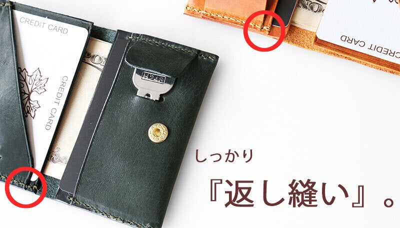 ①カード入れ負荷部分はしっかり返し縫い行い強度を高め、