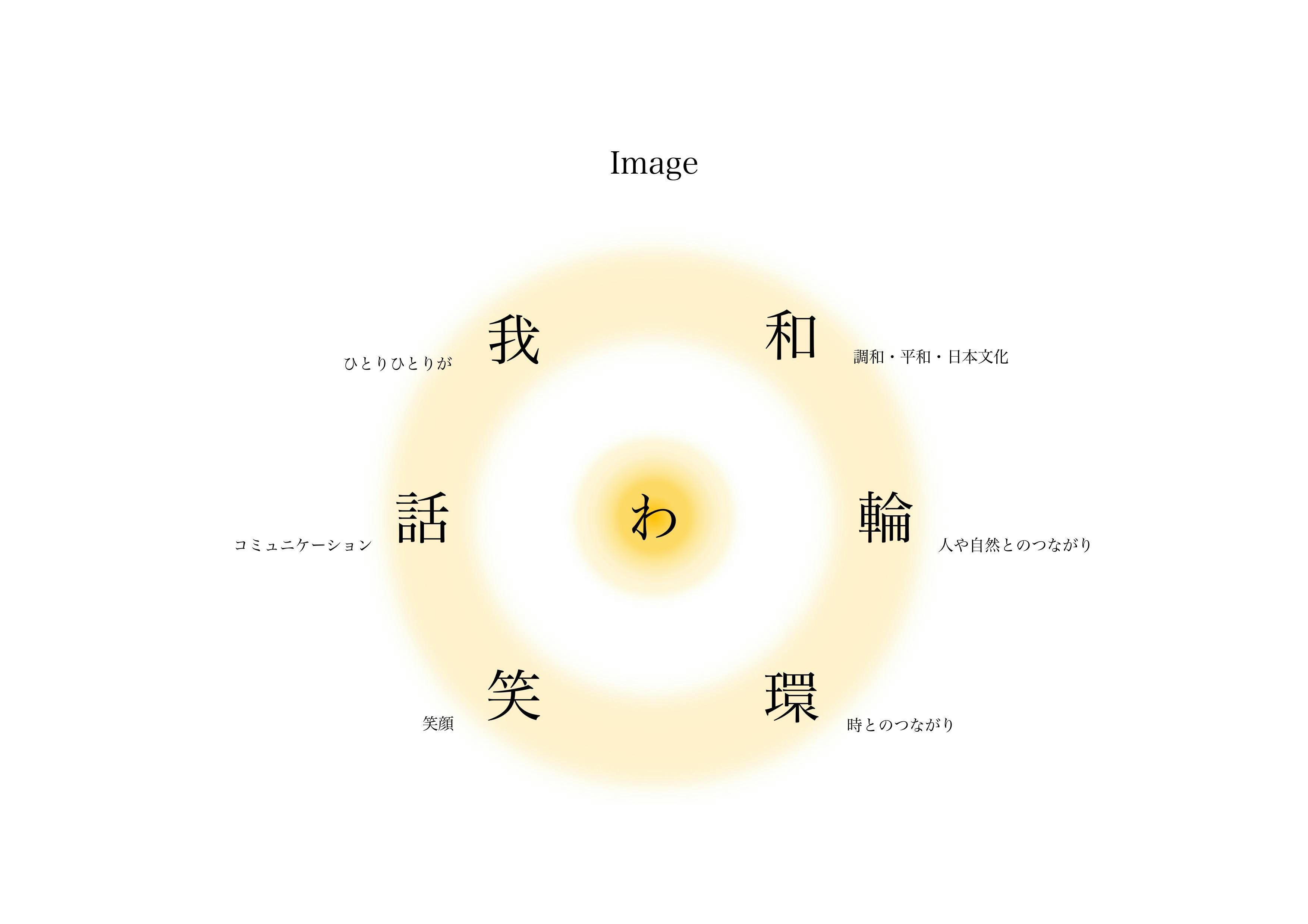 「わ - wa -」とは 「和」「輪」「環」「笑」「話」「我」の6つの要素で構成される、「人が幸せに生きていくための大切な要素」「世界を平和にできる要素」その大切な要素が日本語の「わ」という一文字の中にある。私はその「わ」を光にしました。