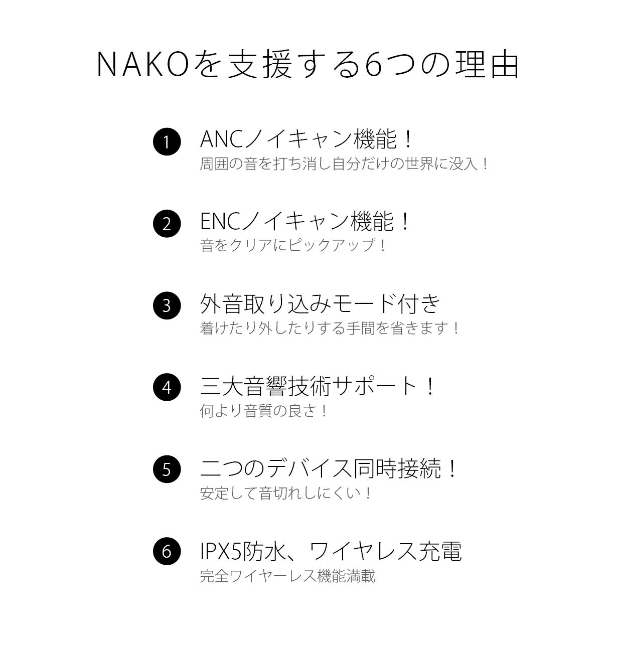 市場に出回っているオーディオ製品を研究・解析し、ANC・外音取り込みモードを含め、ユーザーが望む機能すべてを1つのイヤホンに統合することで、驚くべき多機能なNAKOを考案しました。