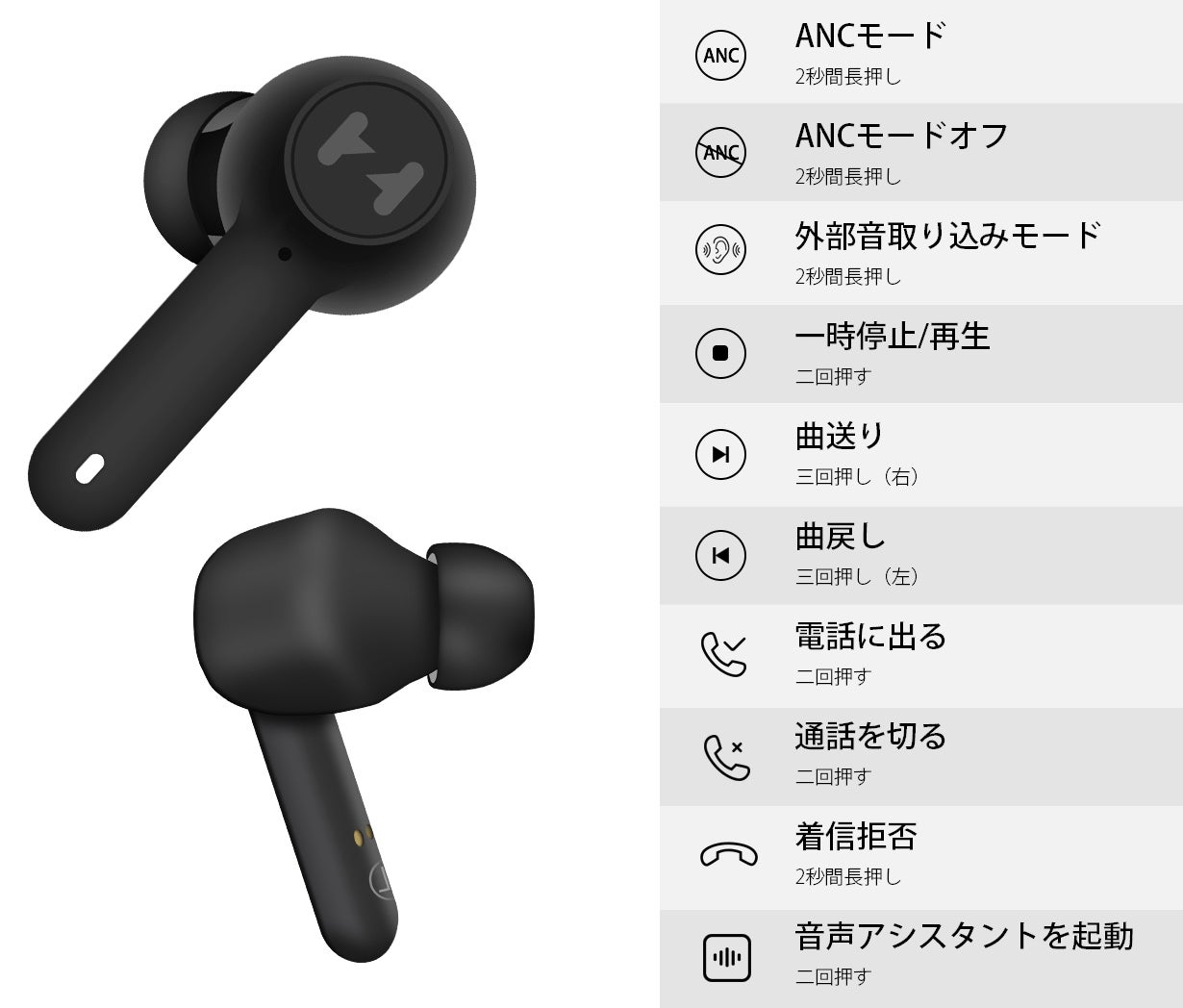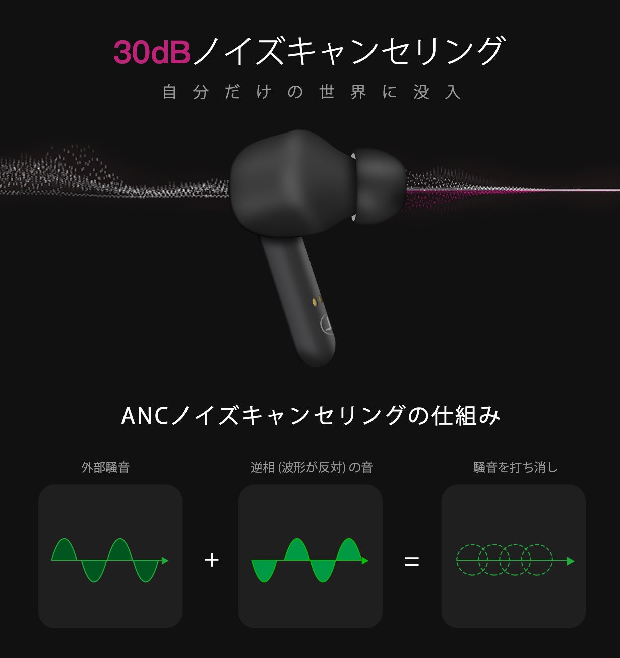 長押しすることで起動する、業界トップクラスの水準の騒音低減効果である30dBのNAKOのノイズキャンセリング。