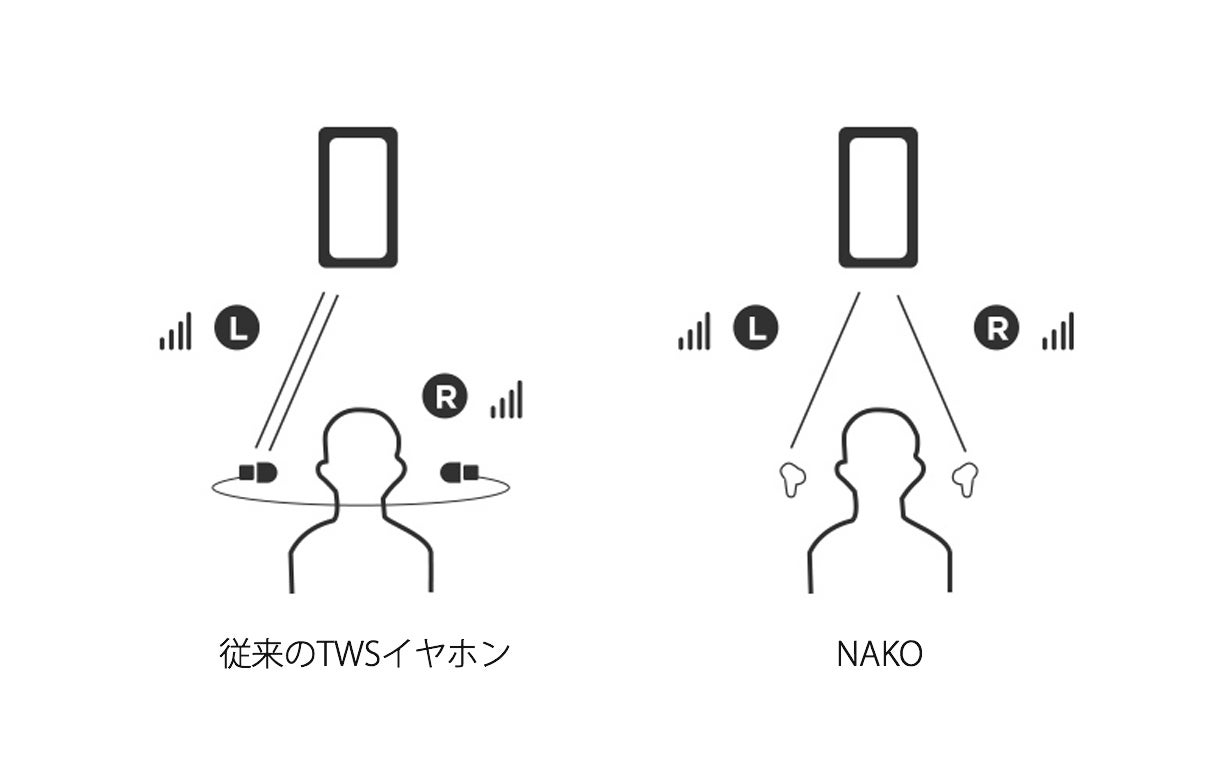 NAKOは左右両方のイヤホンがそれぞれ個別に接続するという方法でこの問題を解決しました。
