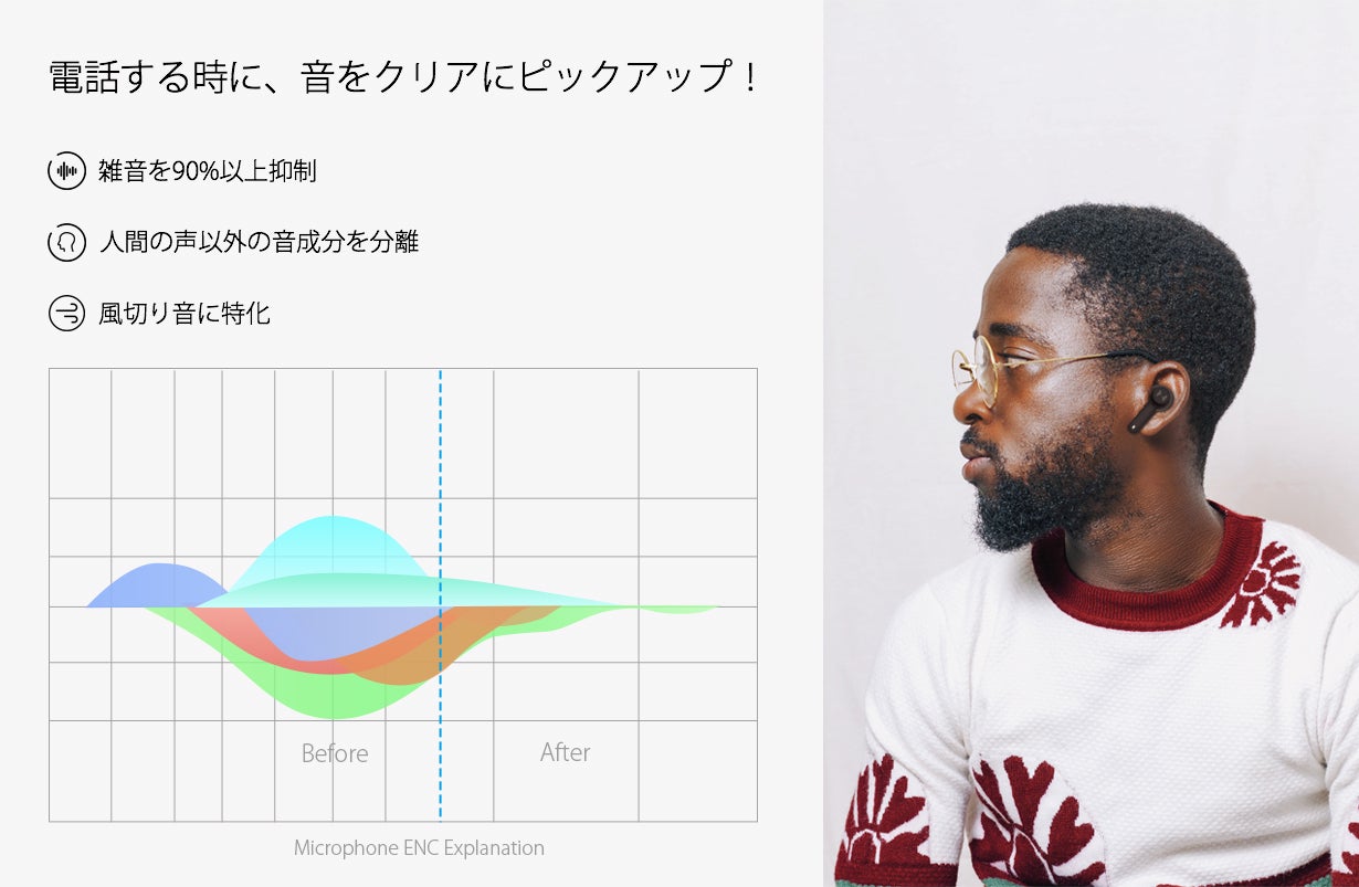 NAKOはENCノイズキャンセリング(Environmental Noise Cancellation)を通じて周囲の様々な雑音を除去することができます。他人の喋り声、交通手段による騒音、風の音など周囲の雑音を90%以上抑制します。30dBの雑音を除去し、高品質のサウンドを提供します。