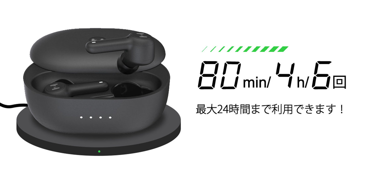 充電ケースでは、フル充電時にイヤホンを6回充電出来るので、ANCモードでも合計で24時間以上!さらにワイヤレス充電可能、バッテリー切れの心配なく、いつでも音楽が楽しめます。