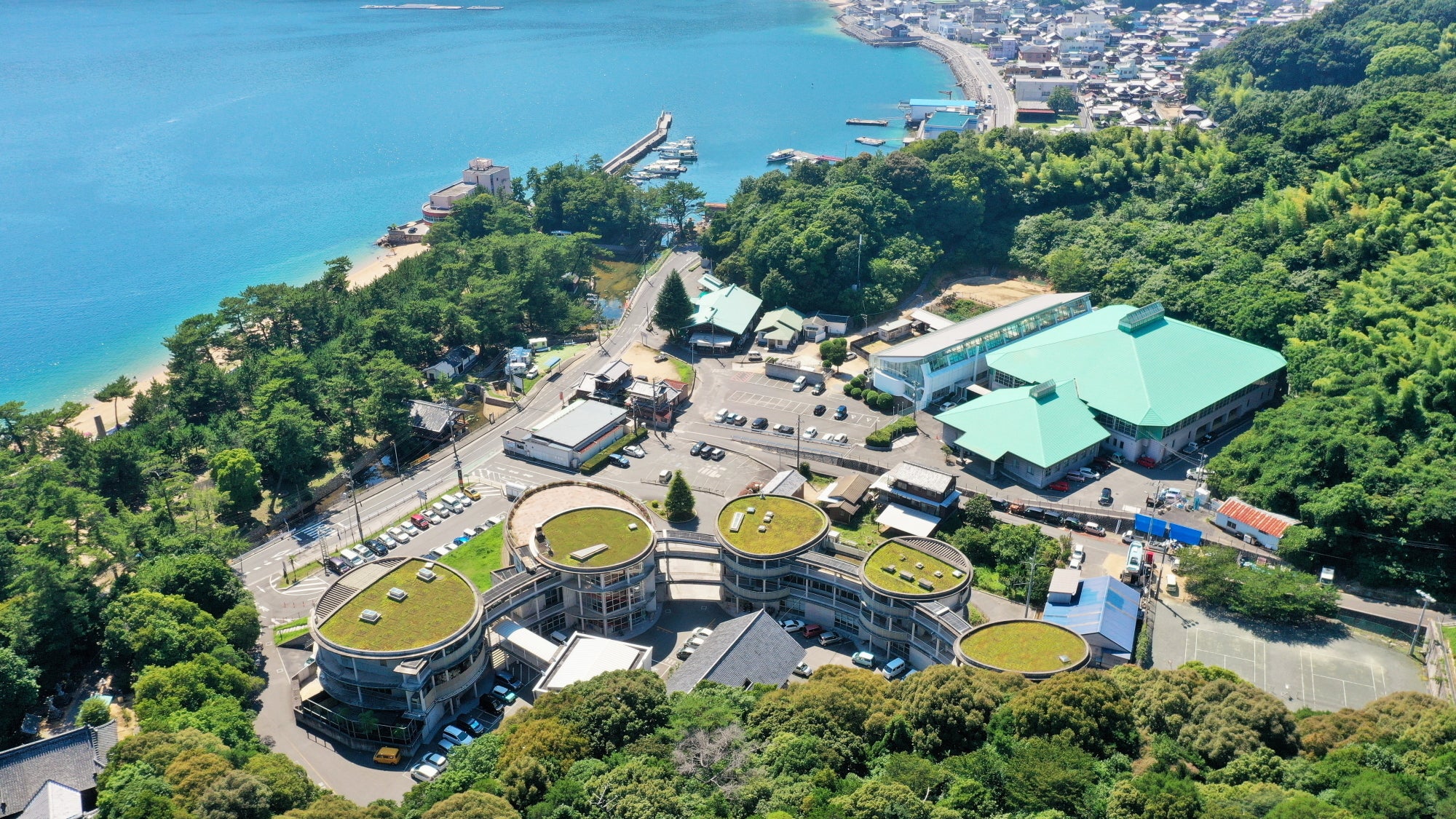 夏場は海水浴客で大変賑わう「白砂青松の桂浜」の向かい側に位置し、コンクリート打放し、円形5棟、3階建ての特徴的な建物は倉橋町のランドマークです。
