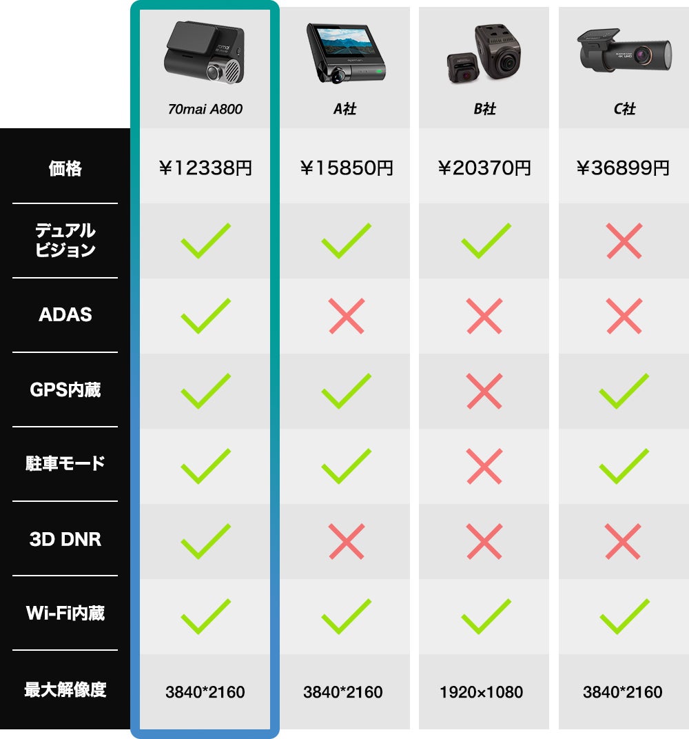 A800 は、だた信頼性が高いだけではありません。車の運転を開始すると、A800 は自動的に録画を開始し、運転中の事故の回避に役立つ車線逸脱警告および前方衝突警告を行う ADAS (Advanced Driver-Assistance System: 先進運転支援システム) が有効になります。