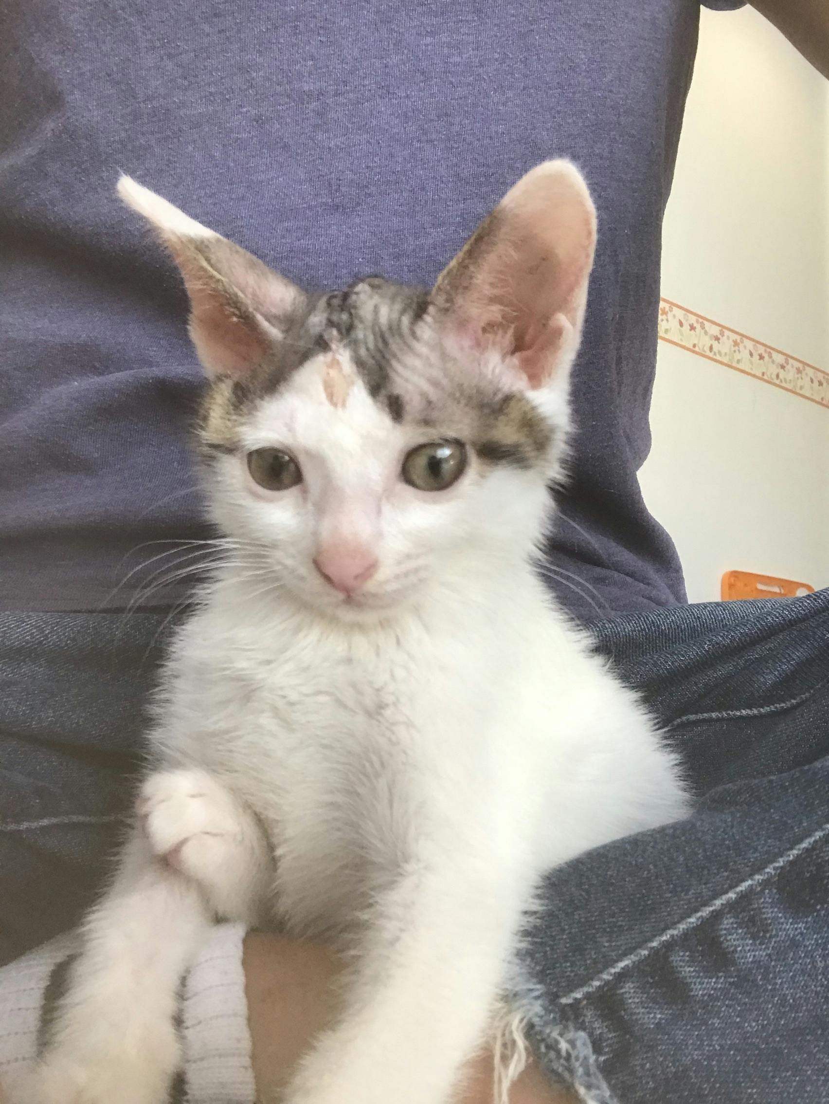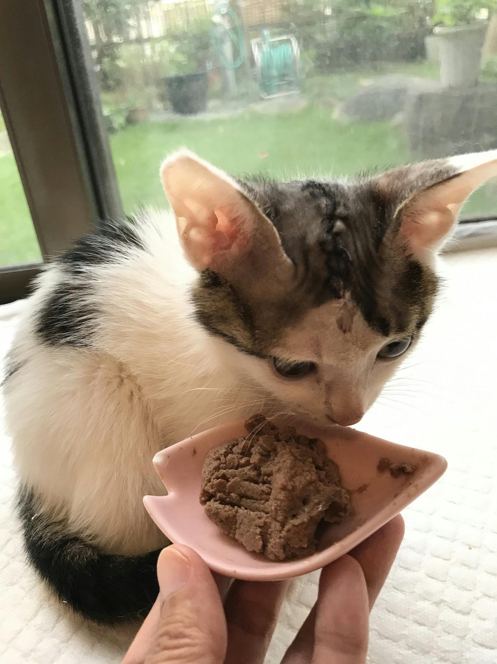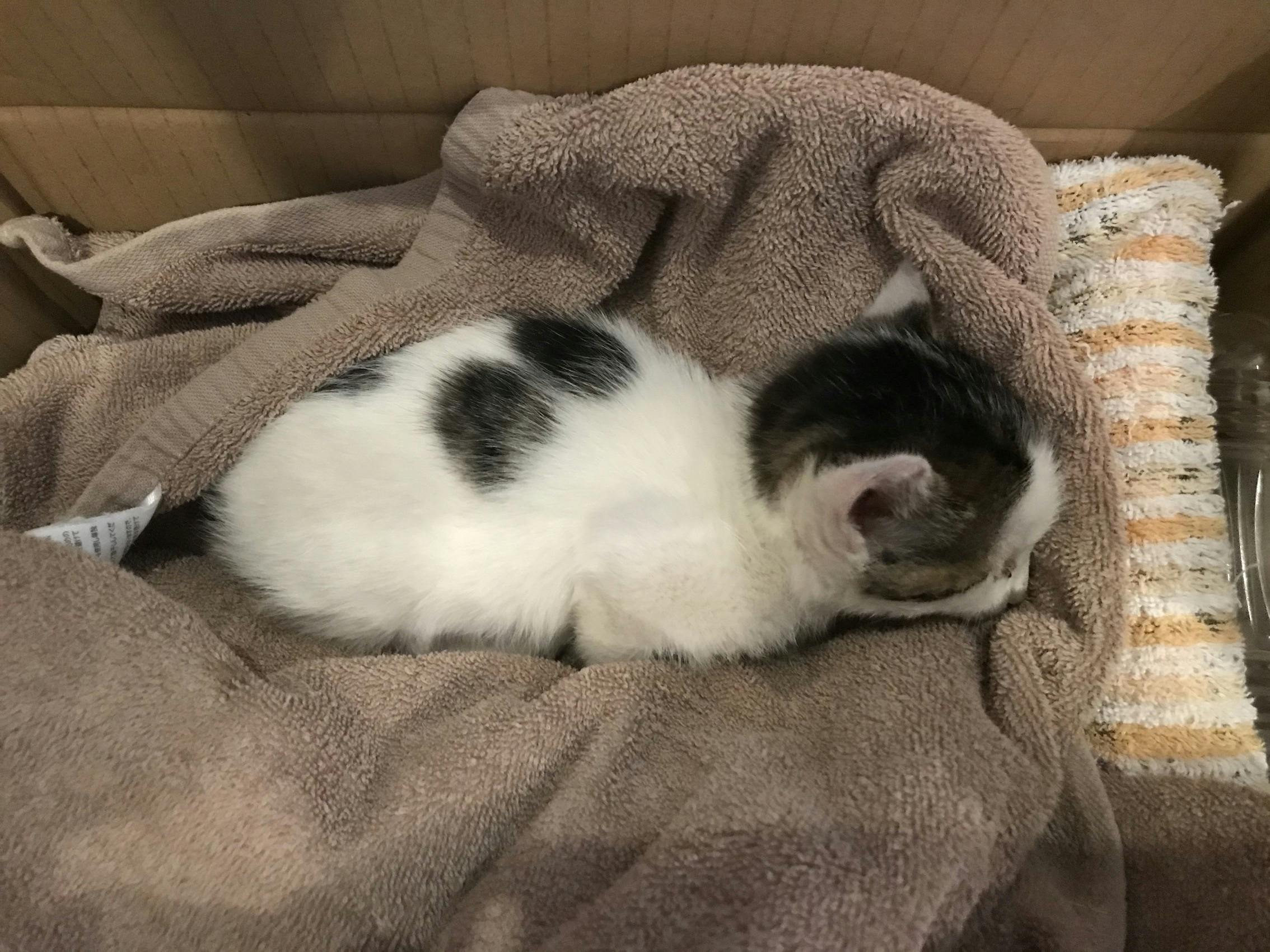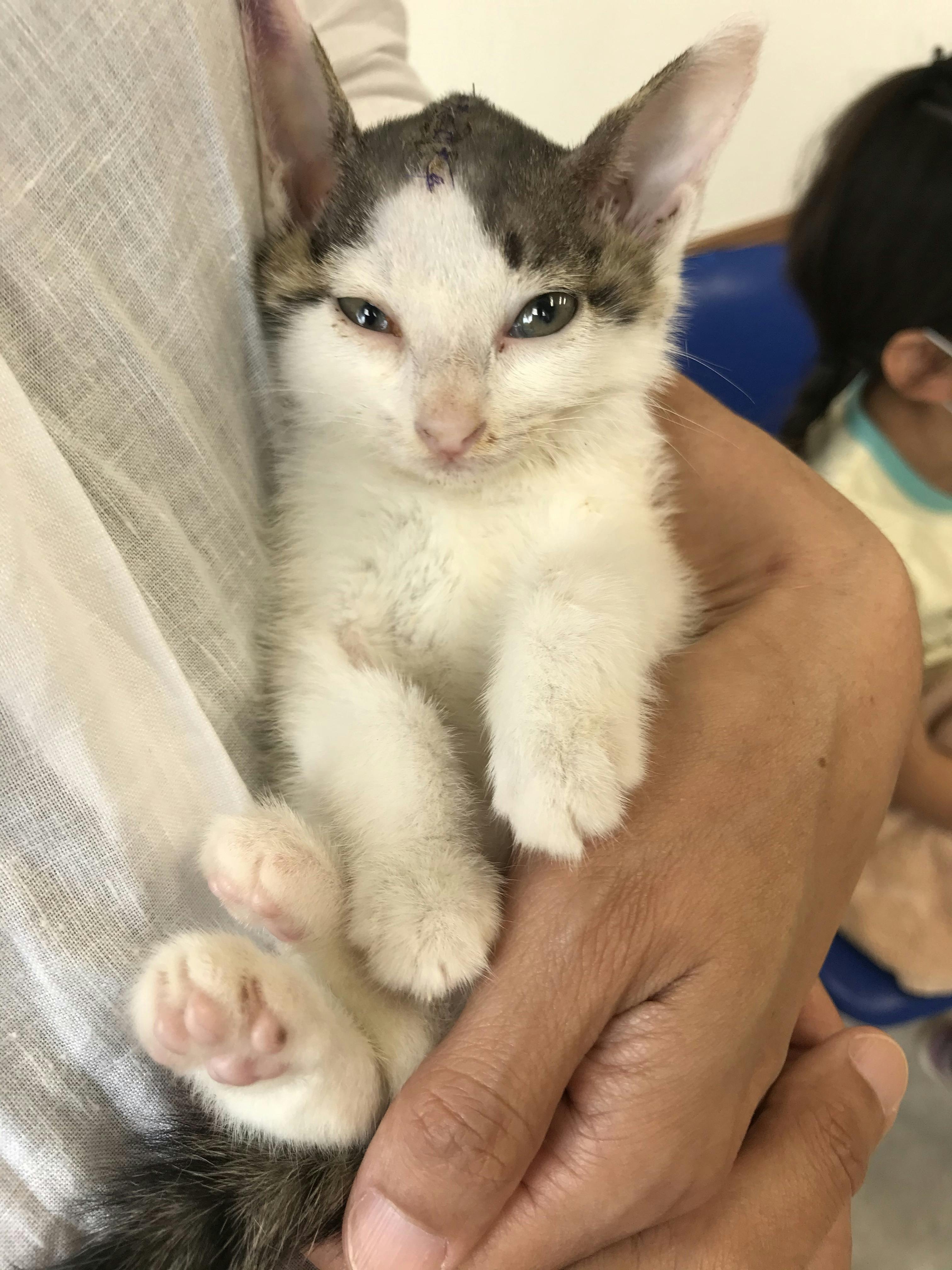 瓦礫に頭を潰されてしまった生後1ヶ月ほどの仔猫を保護しました。