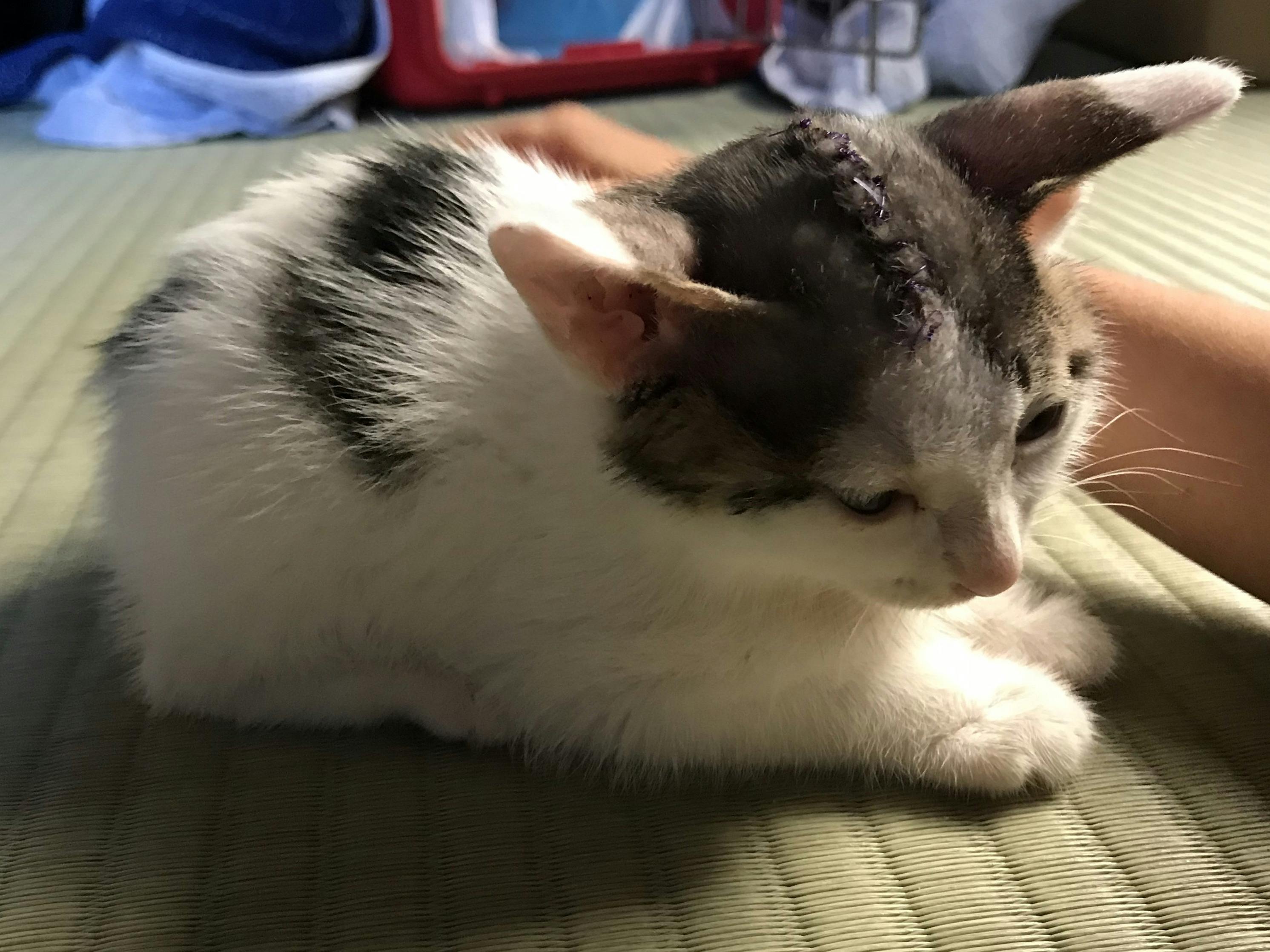 面会に行くと、頭の傷跡は痛々しいものの少しは目も開けられるようになりました。右旋回はするものの、口に入れれば少しながらご飯も食べようとしてくれています。