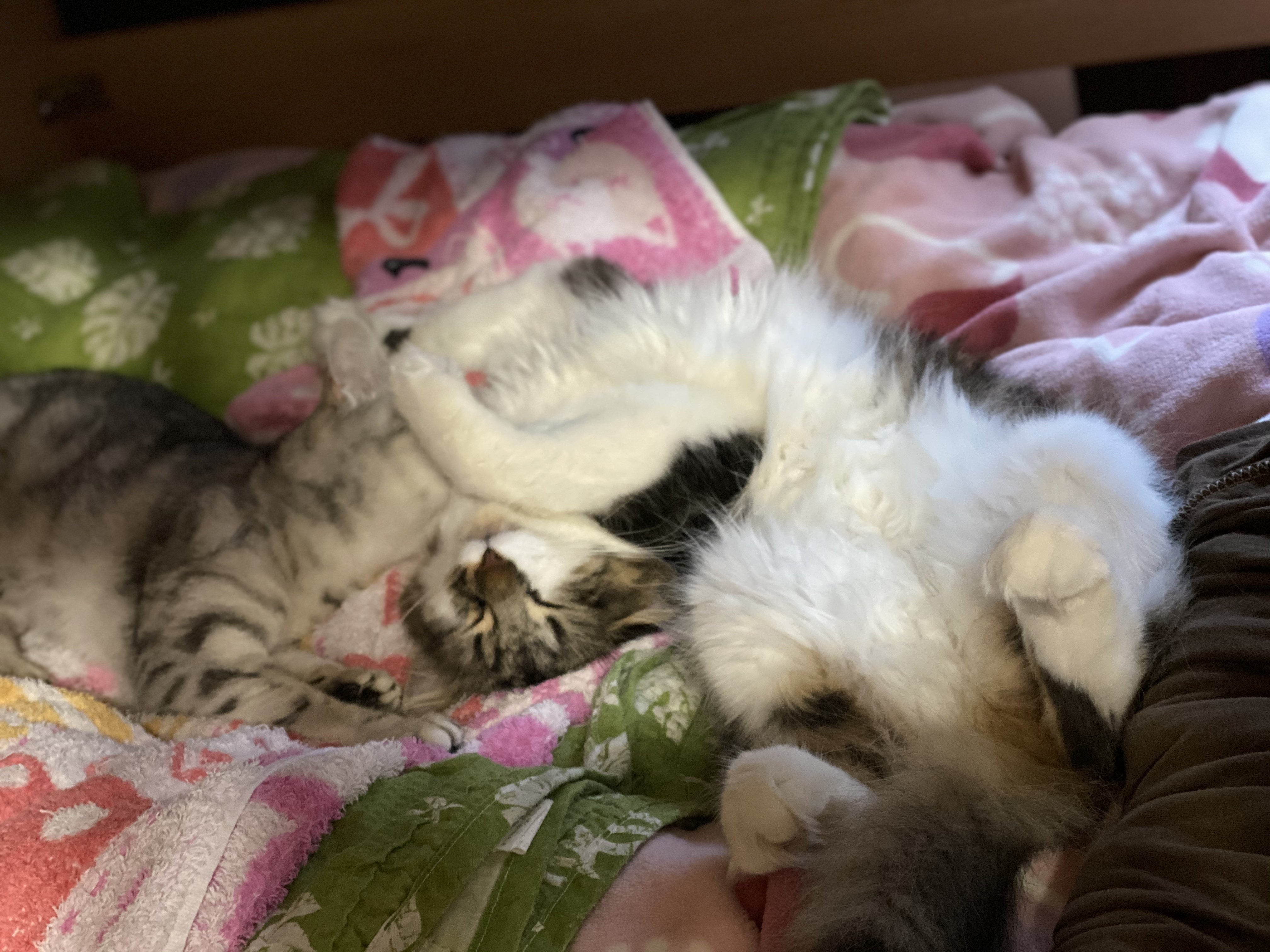 こんにちは。こんばんは。経過観察21日目です。前回から今日までですが、体重の増減は特になく、3.9kg台を維持しております。食事量が増えたので、少しは増えたのかな?と思っていたのですがキャットウォークや棚の上に登れるようにしてあげたら今まで以上に上下運動の量が増えてしまいました。この棚の上は助走無しで90cmジャンプしなければ登れない場所ですが、ここによく居ます。また、降りる時は横着して160cmの高さから降ります。とても弱っていた体とは思えない身体能力になってきています。最近体を触るとなんだか肉付きがよく、むきむきしてきた気がします。この2匹は仲良しです!でも遊ぶ時は手加減なく追っかけっこされるので、家中ドドドドドドっとものすごい早さで走り回られるのでこわいです(笑)趣味兼販売用のマスクや小物を作ったり、娘用の物を作っていると大概側によってきます。毛がついてしまうとまずいので、寄ってくると中断して遊び相手をしております。といった具合で、とてもとても元気に過ごしています。気になる2週間を無事過ぎる事ができ少し安心できました。きなこのこんなに元気で活発な姿を見る事ができてとても幸せです。ご協力して頂いた方々には感謝しております。これからも活動報告にてきなこの様子を伝えていきますが、SNSだと日に何度か投稿したりとこちらよりも頻度が高いのでよかったらTwitterきなこ を見ていただけると、より一層きなこの様子が分かるかと思います。またなるべく間をあけないように報告したいと思います。それではこのへんで・・・