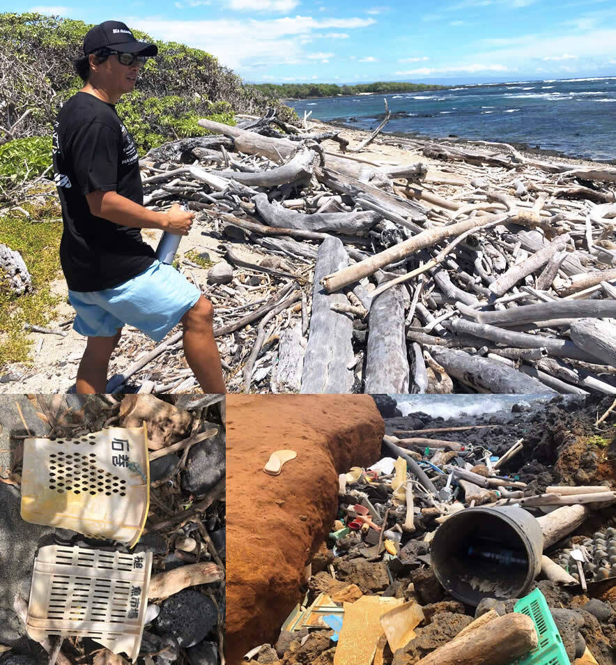 数年をかけてハワイ諸島の岸辺には、日本方面から流れ着いたゴミがあります。