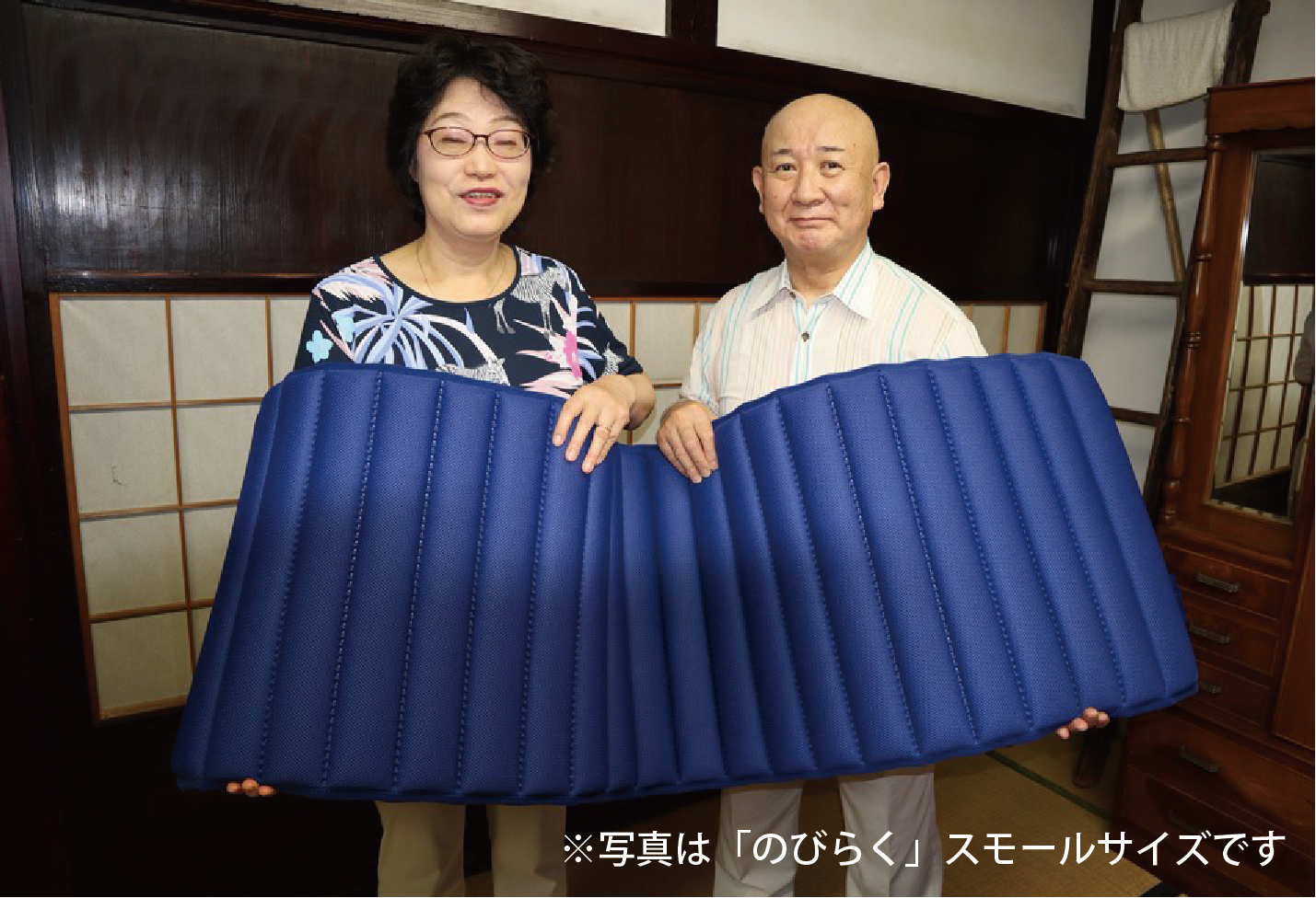 くるくると丸めて収納できる「のびらく」を、私は自宅と事務所に一つずつ置いて使っている。自宅ではベッドマットレスの上に敷いて寝ているのであるが、背骨が伸びている感覚がとても心地よい。睡眠時に伸びをするような感じで寝ているようになり、寝相が良くなった。目が覚めて、体がだるいと思うことがなくなり、早起きが苦手だったがすっきり目が覚めるようになったのは嬉しい。
