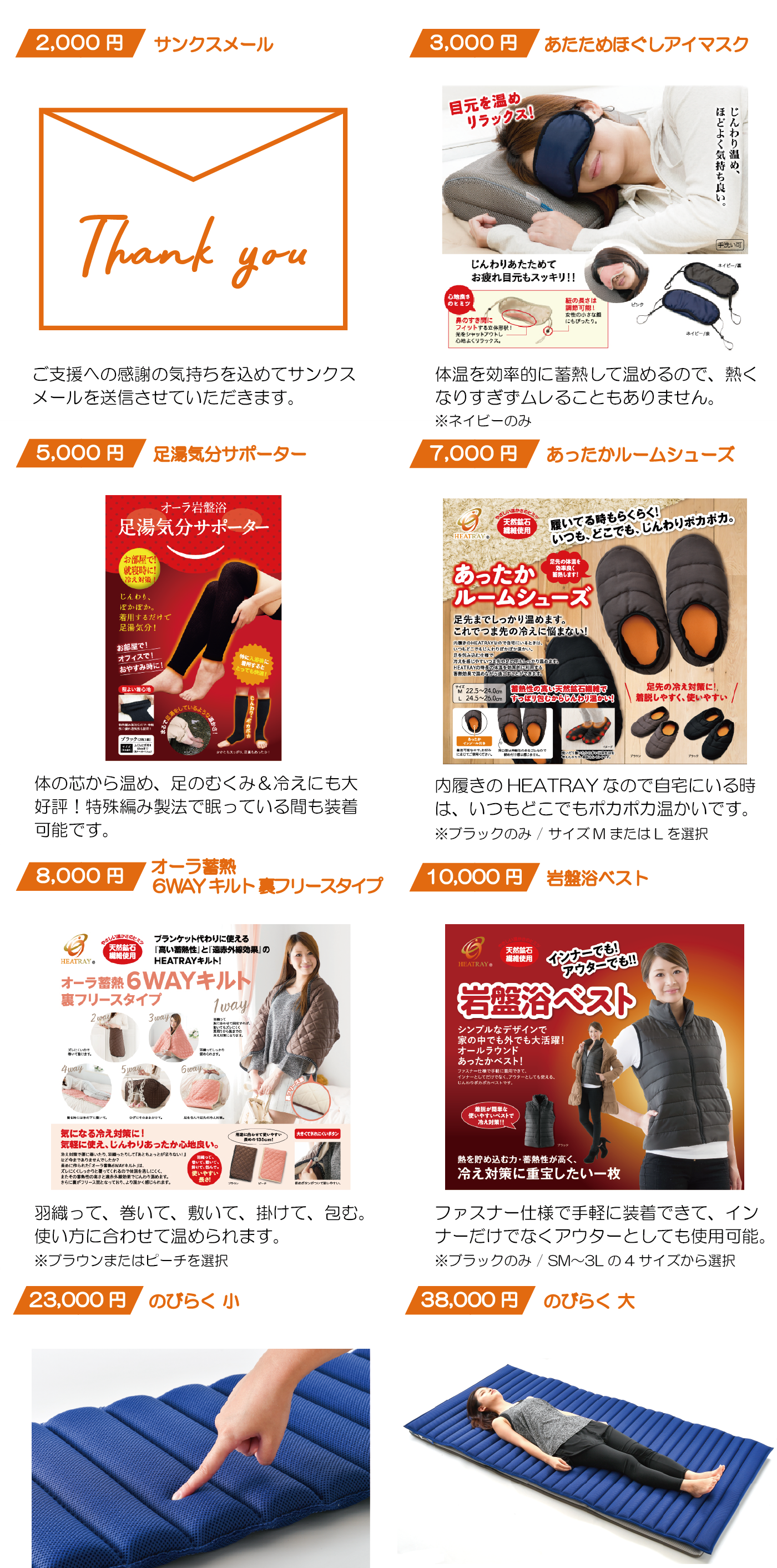 現在商品化している「のびらく」の2サイズに加え、弊社がこれまでに開発してきた人気商品をリターン商品として、ご支援に対するお気持ちにしたいと思っております。なお、サンクスメールは全てのリターン商品につけてお送りします。