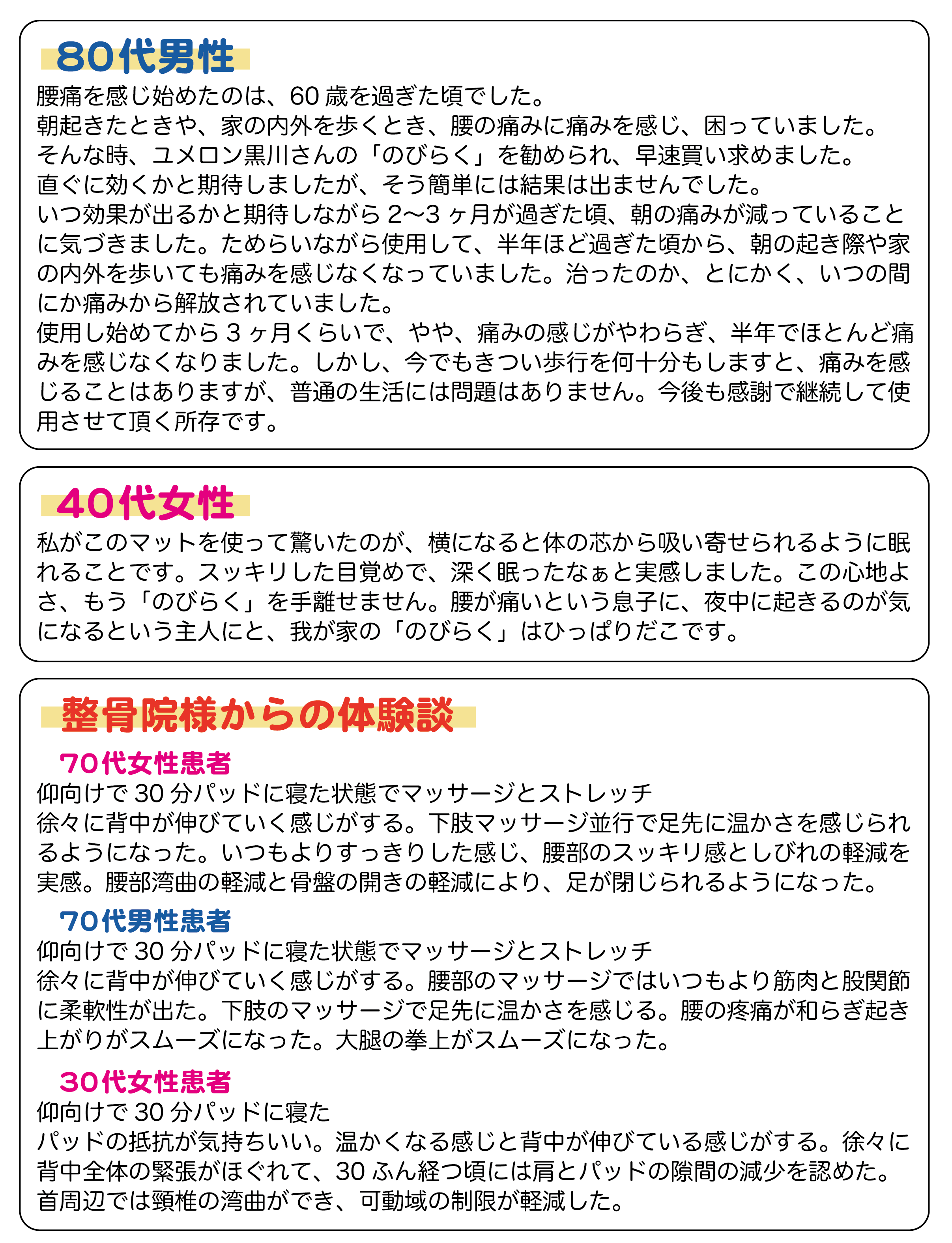 これまでマットレスの硬さが自分には合うものがなく、いろいろと試していたが「のびらく」によってマットレスの性能に関係なく、気持ち良い眠りを得ることができた。