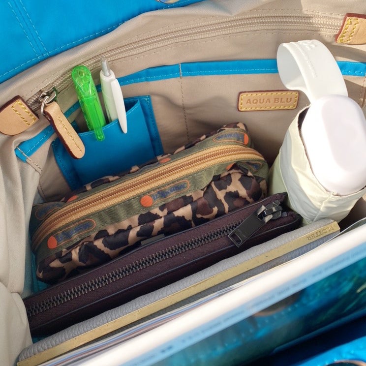 12インチのノートPC、長財布、化粧ポーチ、ペットボトル、携帯、手帳、サングラス、折りたたみ日傘、タオルハンカチ、ペン2本、ノート(20cm×17cm)、B5サイズのフリーペーパー2冊、変形A4サイズのフリーペーパー(21cm×27.5cm)