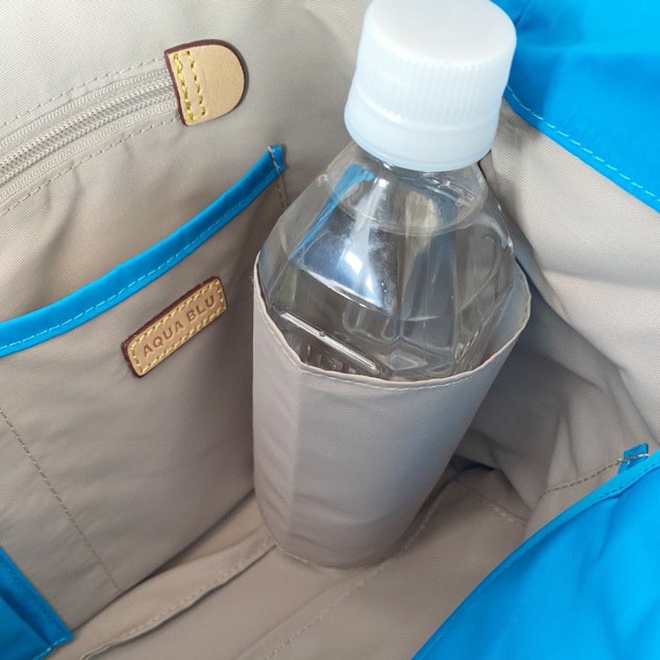 必ず横に倒れて場所をとるペットボトルも、定位置に立てて収納できて、バッグの中身もこんなにスッキリ。