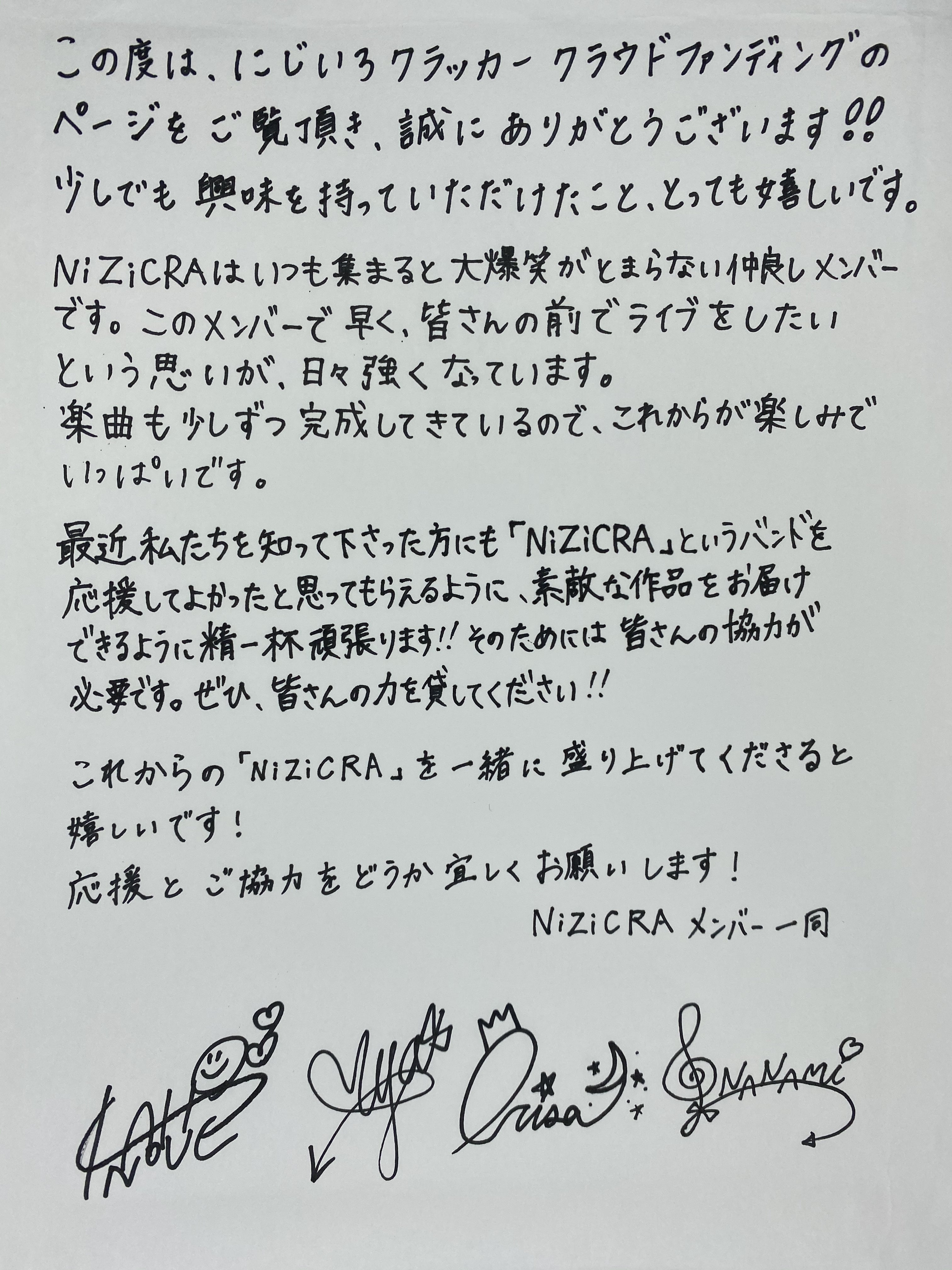 今回のクラウドファンディングは、資金調達だけでなく、「NiZiCRA」の音楽、私たちの想いに共感してくださる皆様と繋がるためのプロジェクトでもあり、楽曲を作って世の中に届けていくことで、思いを形にし、それを広く届けていくための一つの手段になります。