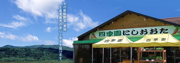 広島県世羅町にある産直市場『四季園にしおおた』です。米どころ世羅町、田園風景の広がる中に産直市『四季園にしおおた』があります。四季を通じで旬の農産物が揃う店です。山の香、土の香、花の香、旬の香がいっぱいです是非ご来店ください。