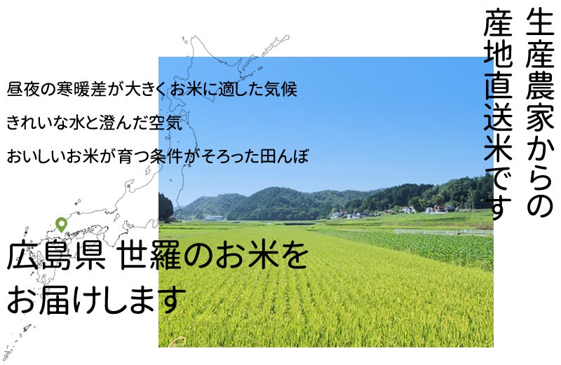 世羅は古くからの米どころ、高原の気候と源流のきれいな水で良質の米が収穫されています。