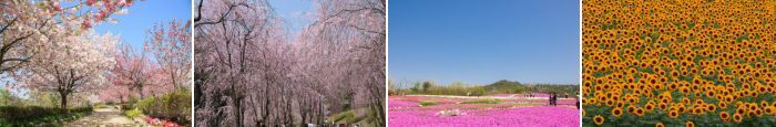 世羅町は、広島県の中東部に位置しています。地形は、通称「世羅台地」と呼ばれ350m~450mの台地を形成し、瀬戸内海に流れる芦田川水系と、日本海に流れる江の川水系の分水嶺となっています。気候は、年平均気温13度、年間降水量1,300㎜で、穏やかな気候と風土に恵まれて、春夏秋冬、四季折々の装いを見せます。 町内には、複数の大規模な花農園があり、各農園では四季折々、色とりどりに咲き誇る美しい花畑が見ら