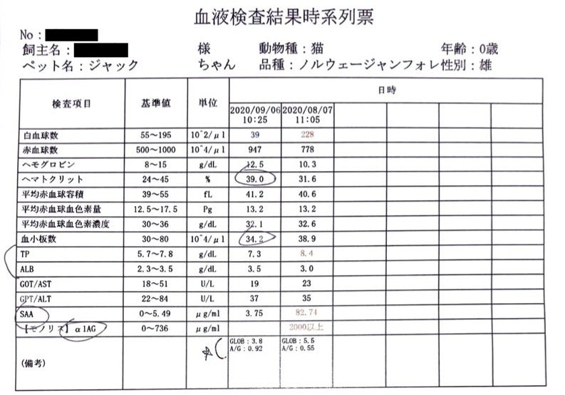 FIPの症状として成長が鈍化することが多い。体重が増加しているので症状は良い方向に向いている。また、治療中の増加は、再発のリスクが下がる