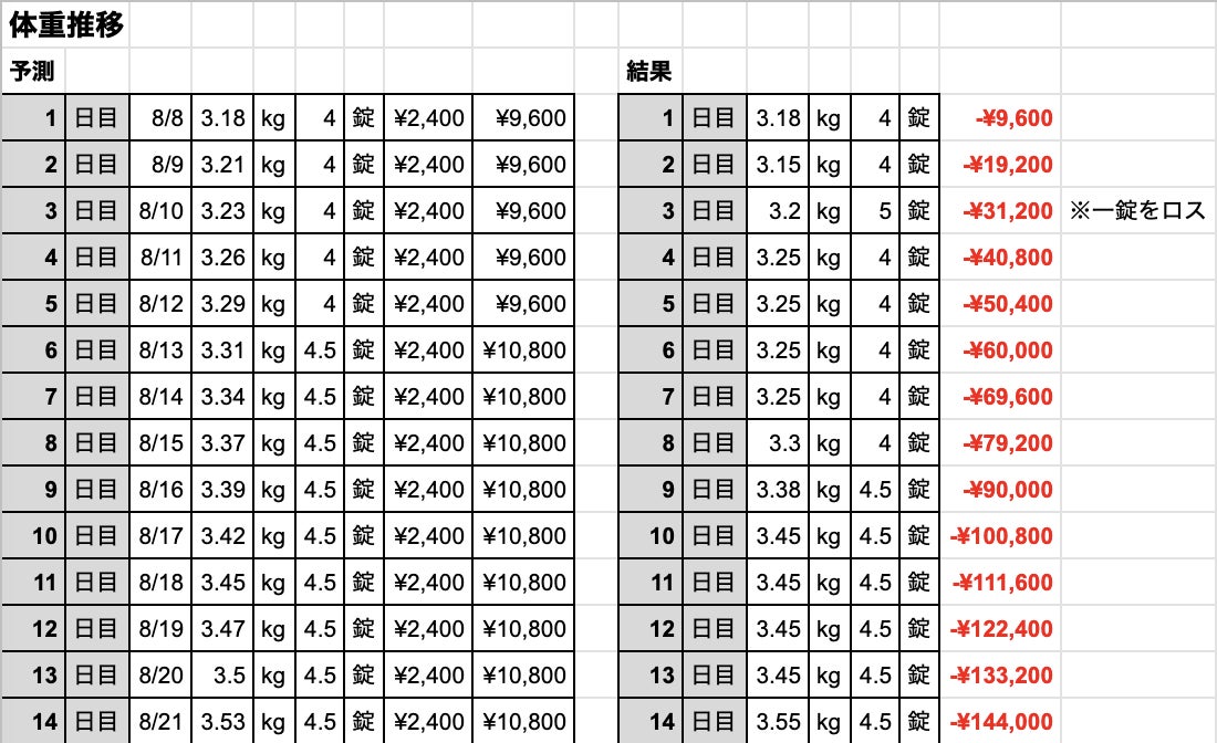 中間報告です。目次○体重、薬代の推移○ファンディング状況○ジャックの体調体重の推移ほぼ予測通りの体重の増加をしています。体重の推移と薬の合計額ファンディング状況ファンディングまとめ皆様と繋がれたこと、アドバイスをいただくこと、励ましをいただくこと。形に変えられない気持ちが大変嬉しく思います!ジャックの体調来月の検診まではっきりしたことは分かりませんが、見た感じは回復傾向にあると思われます。当初、先生から言われていた「食事の量が減っていく可能性がある」といわれていましたが、食事の量は変わりなく過ごしています。便、尿からは変わったことはありません。