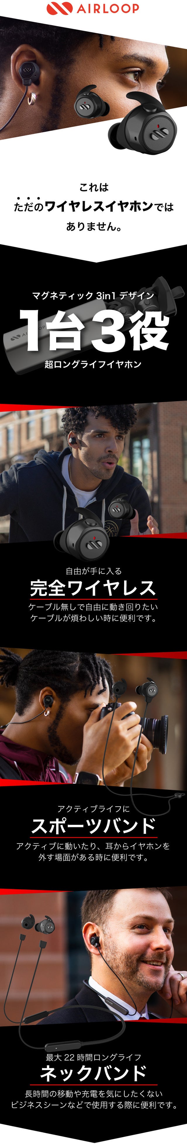 AIRLOOPはTWSイヤホン(完全ワイヤレスイヤホン)として、アクティブなあなたの要望にもお応えします。イヤホンも身体の一部にしたいジムでのワークアウトや激しいダンスなどでは完全ワイヤレスが便利です。