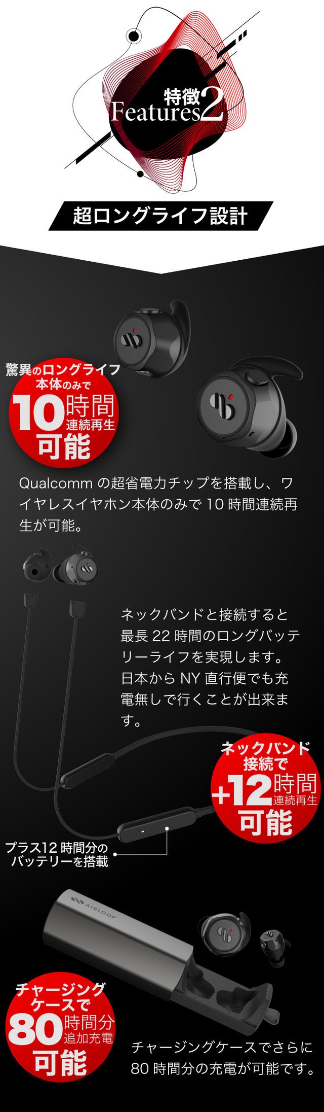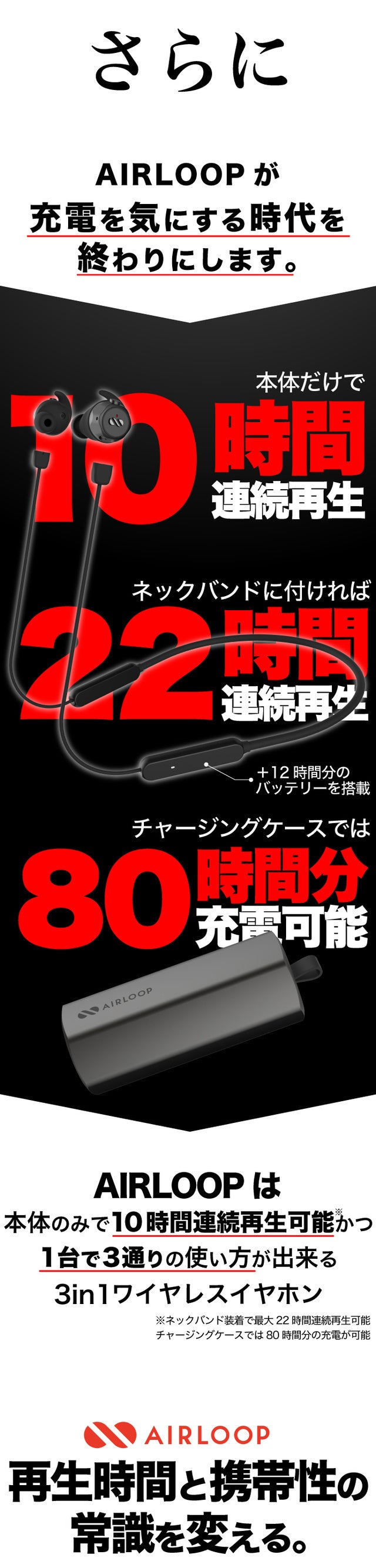 特許取得済みのAIRLOOP Link™技術により、TWSイヤホンはネックバンドに簡単にマグネットで接続することができます。ネックバンドはイヤホンのバッテリーを最大12時間伸ばすことが可能です。