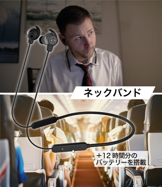 ネックバンドはイヤホンのバッテリーを内蔵しています。最大22時間連続使用が可能になるため、通話での充電消耗が激しいビジネスシーンや、長距離フライトなどの移動時でもネックバンドがあればバッテリー切れを気にすることなく使い続けることが可能です。